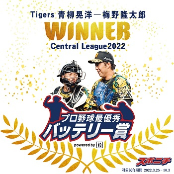 株式会社スポーツニッポン新聞社(本社:東京都江東区、代表取締役社長:小菅洋人、以下スポニチ)が制定する「2022プロ野球最優秀バッテリー賞 powered by DAZN」の選考委員会が都内で開かれ、セ・リーグは阪神タイガースの青柳晃洋投手(28)と梅野隆太郎捕手(31)、パ・リーグはオリックス・バファローズの山本由伸投手(24)と若月健矢捕手(27)に決定しました。青柳投手、梅野捕手は初受賞、山本投手、若月捕手は2年連続2回目の受賞になります。4選手には賞金100万円と協賛各社から副賞が贈られます。