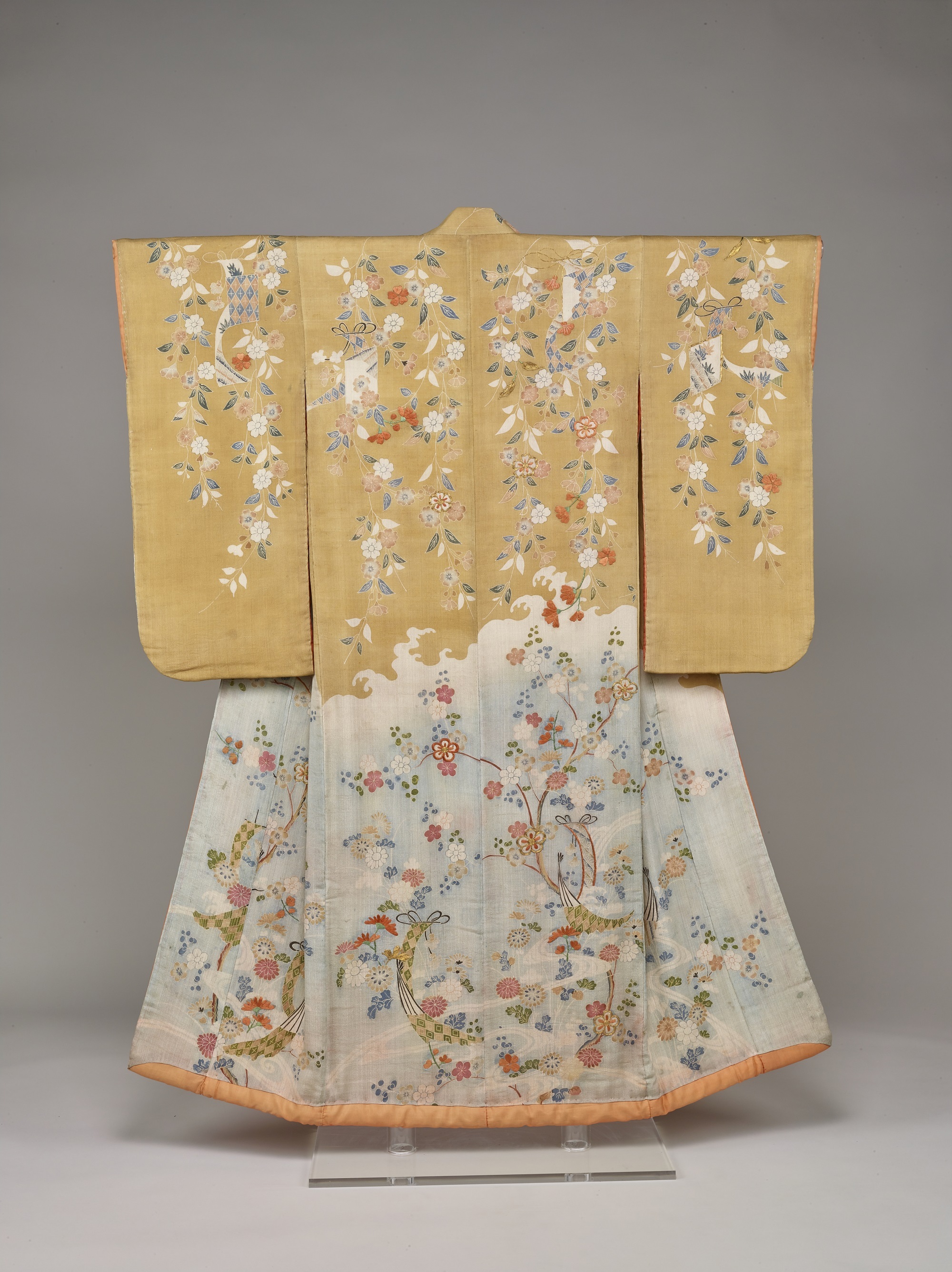 枝垂桜が肩にかかる模様を友禅染で表します。上下にわけるスタイルは江戸時代中期に流行しました。