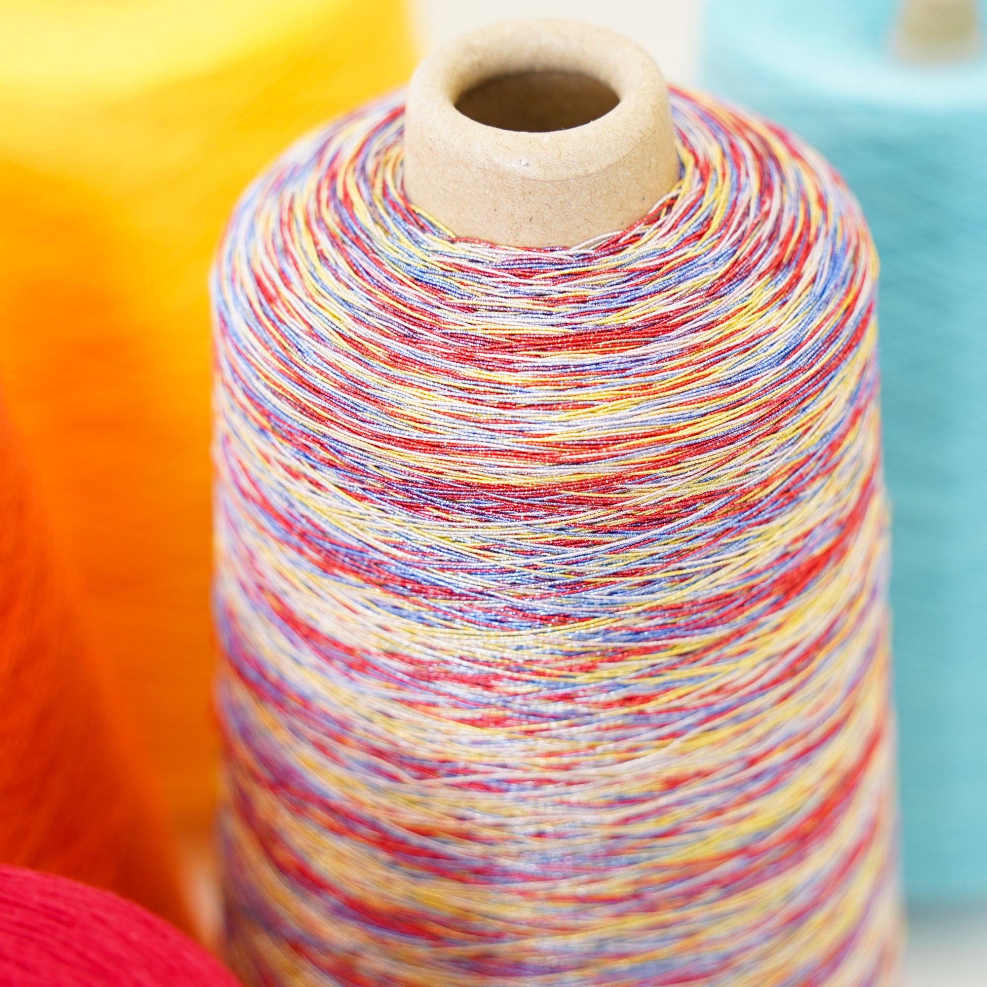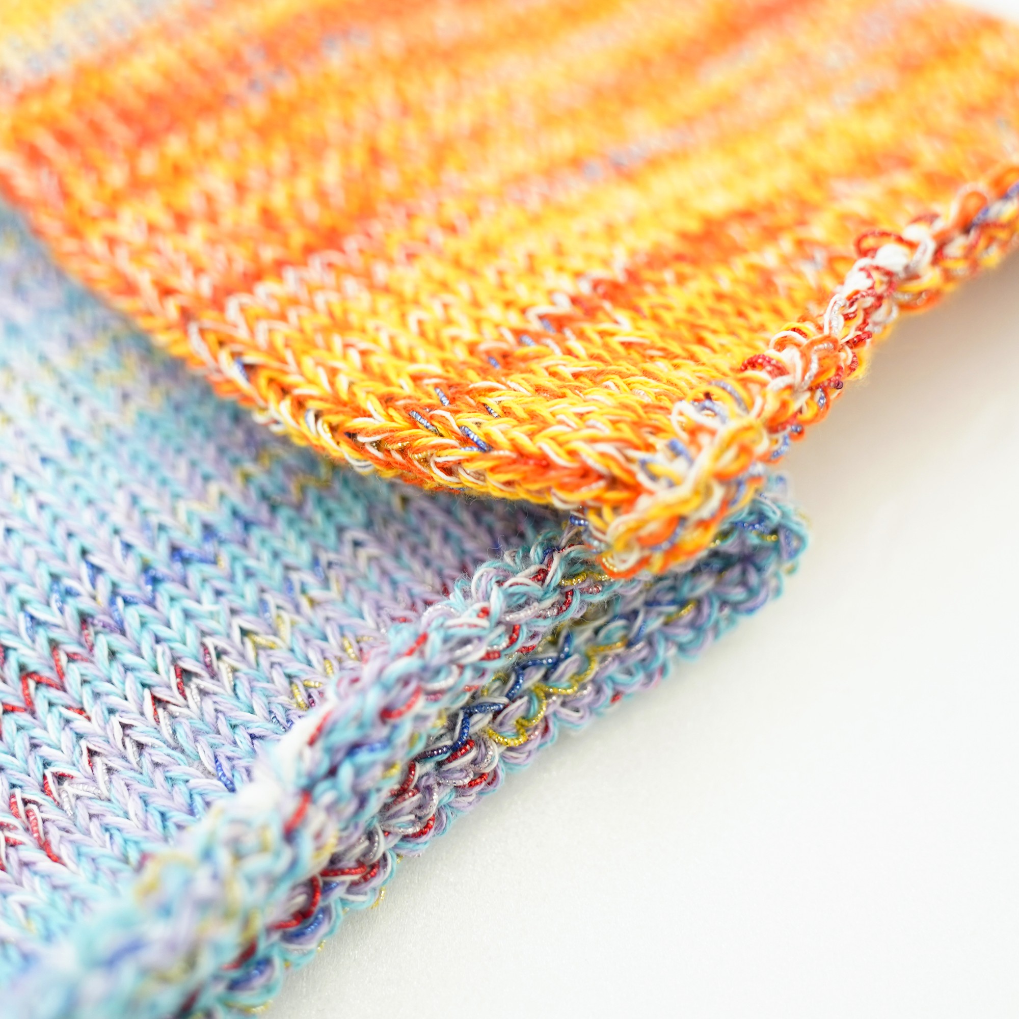 S.Laboでは、季節ごとに限定の糸を用意しており、そのたびに好評を博しています。今回の“キラキラかすり糸”は、夏祭りのヨーヨーを思わせるようなカラフルさに、ラメの輝きをプラスした、まさに“夏”を感じる特別仕様。