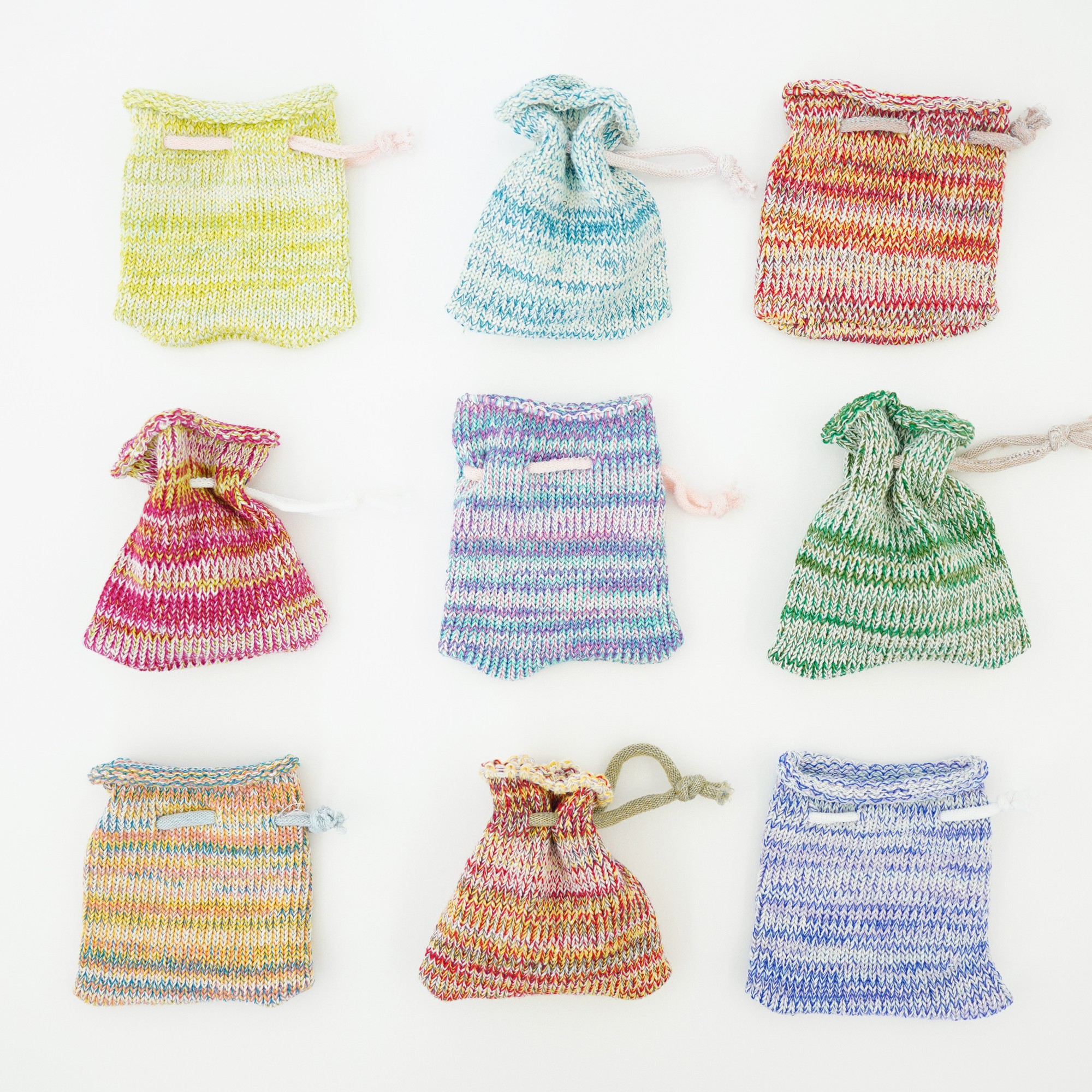 キラキラかすり糸を選んでくださった方には、チャリックスの編み地とくつ下のつま先を縫製するときにできるわっか状のハギレ「ソックループ」を活用して制作した、S.Laboオリジナルミニ巾着をプレゼント(数量限定)。毎回配布のたびに「また欲しい」と声があがる、人気のノベルティです。