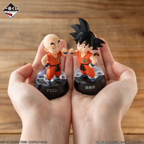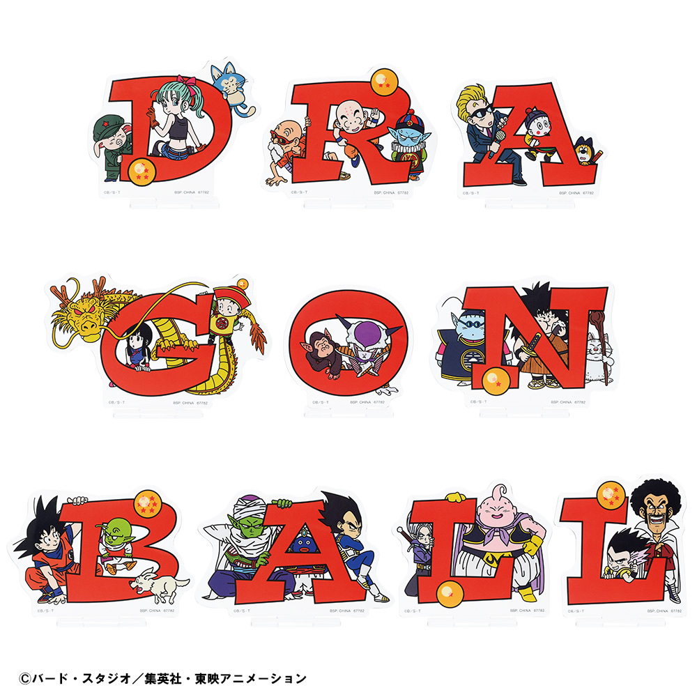A賞からG賞まではキャラクターたちがこちらを見上げているような、目を合わせることが可能になった新しいフォーマット「ASSEMBLE」のフィギュアシリーズが登場します。A賞は「孫悟空」、「孫悟空(紫道着ver.)」、「占いババ」、「孫悟飯」のフィギュア。B賞には「亀仙人」、「亀仙人(黒道着ver.)」、「ウミガメ」、「牛魔王」、C賞は「ブルマ」、「チチ」、「ランチ」「ランチ(金髪ver.)」、D賞は「クリリン」、「クリリン(スーツver.)」、「ウーロン」、「ヤムチャ&プーアル」のフィギュアが続きます。加えて、E賞に「天津飯」、「餃子」、F賞に「ピラフ」、「シュウ」、「マイ」、G賞には「カリン」、「ヤジロベー」、「ウパ」のフィギュアがラインナップ。集めると、まるで集合写真のようにこちらをみんなで見上げているような飾り方が楽しめます。このほか、各アルファベットに様々なキャラクターを描いたH賞のアクリルスタンドは、全10種を集めて並べることで『DRAGON BALL』の文字が完成します。