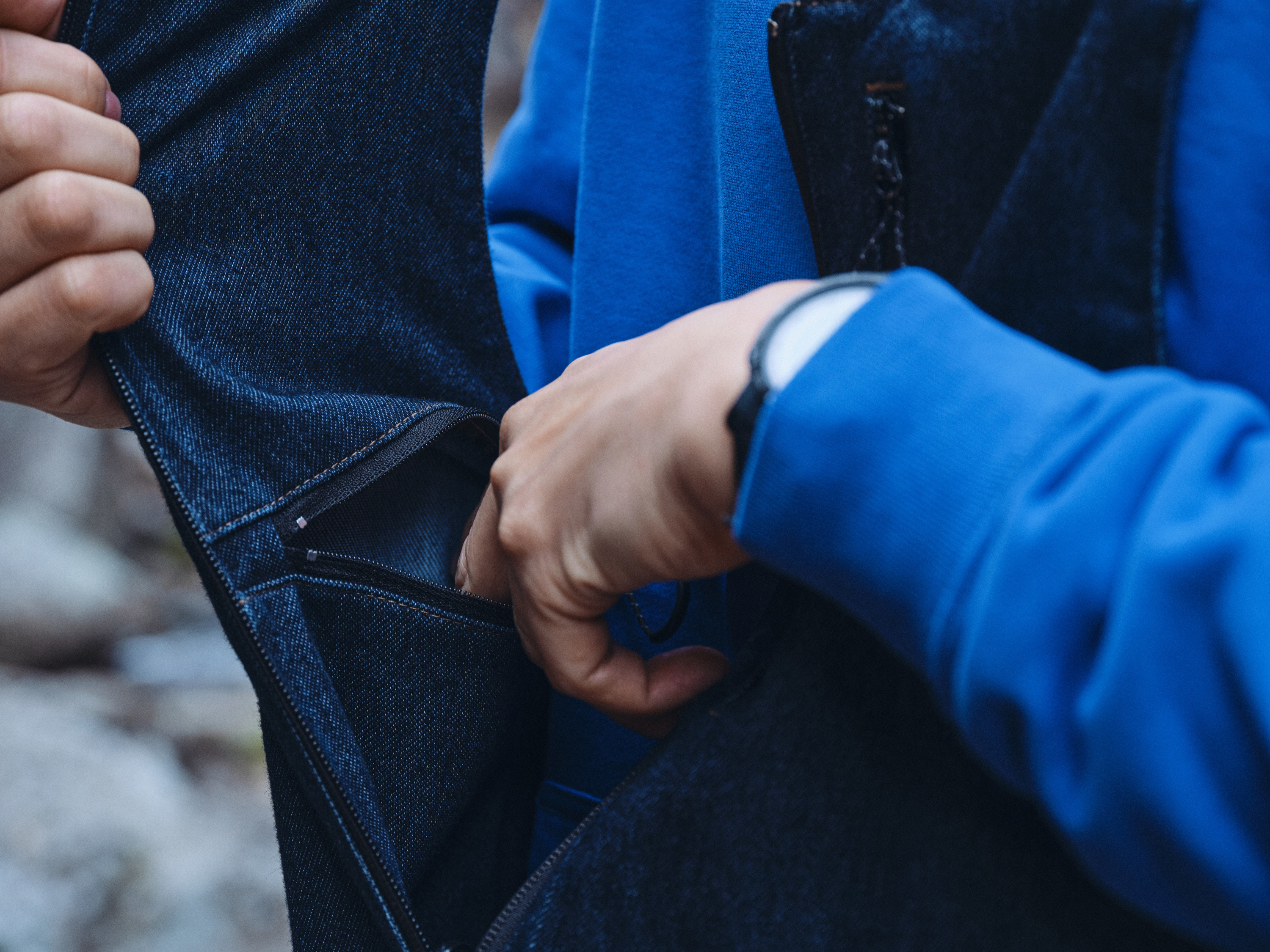 見た目はデニムそのものですが、実は編み組織によって作られているジャージー素材。その為、デニムにはないタテヨコ360°の伸縮性を持つ、ノンストレス素材。色目はインディゴにワンウォッシュを施した「c/#OWI(ワンウォッシュインディゴ)」とホワイトを生成り色に染め上げた「c/#ECR(エクリュ)」を採用した、両ブランドを代表するSignatureを組み合わせたスペシャルアイテムです。