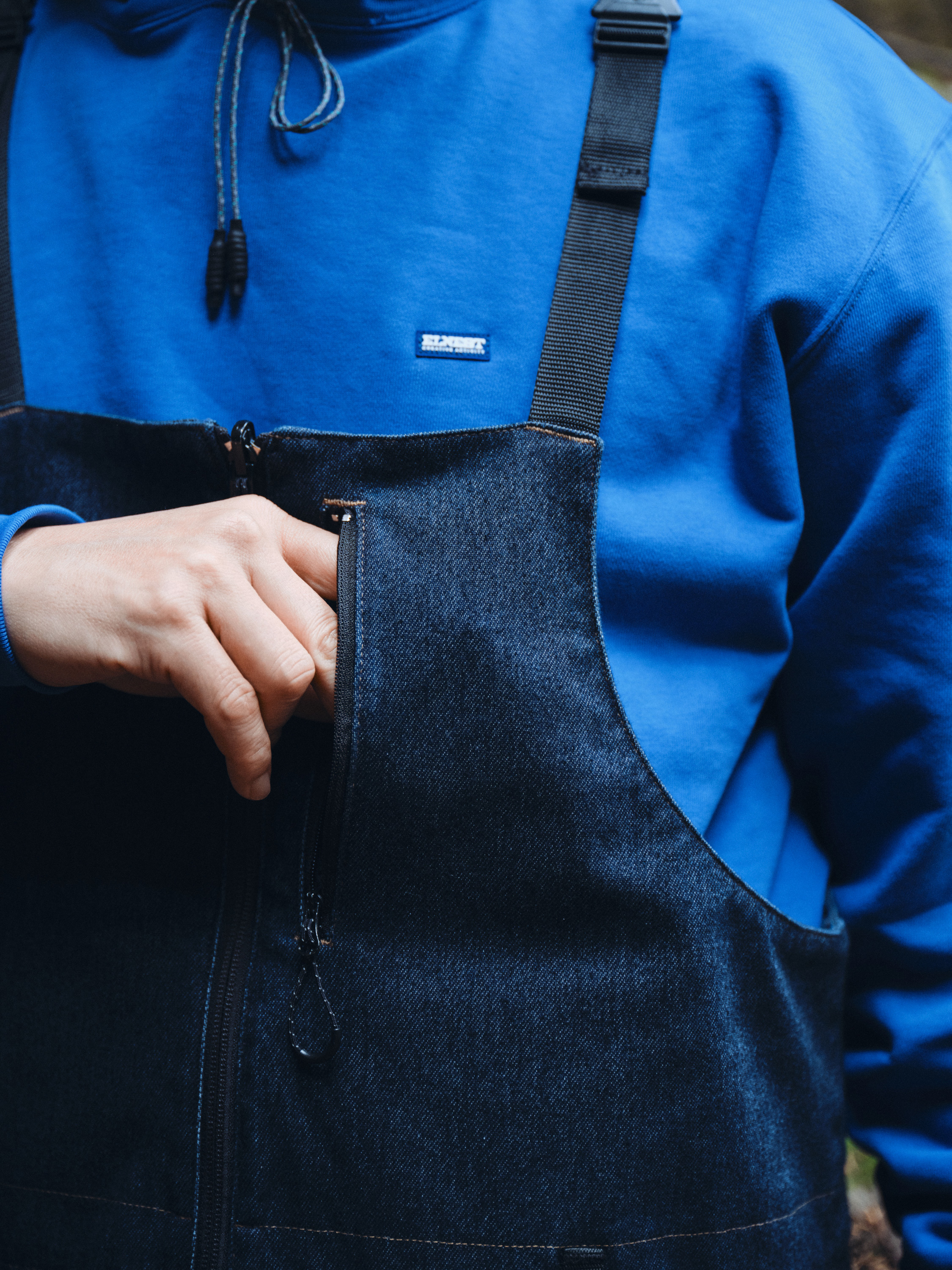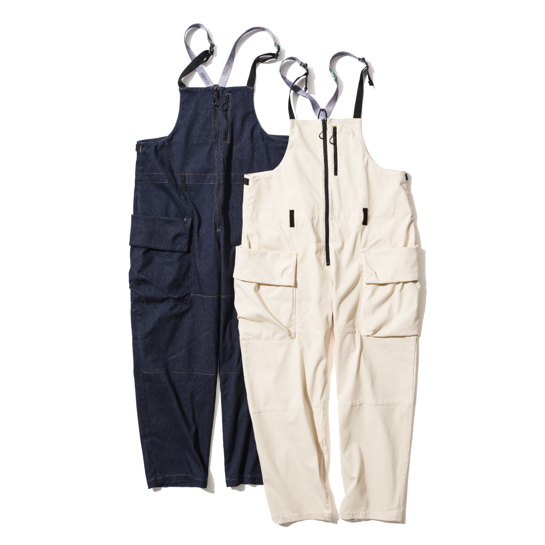 ELNESTのSignature itemの一つであるオーバーオールを、YANUKのオリジナルファブリックである「DENIT」で表現したスペシャルアイテム。ゆったりとしたシルエット、着脱がしやすいフロントのZIP UP、リフレクターの引手、収納力バツグンのサイドポケット等々の特徴は残しつつ、サイドポケットは更に大きく変更し、後ろポケットを省略。