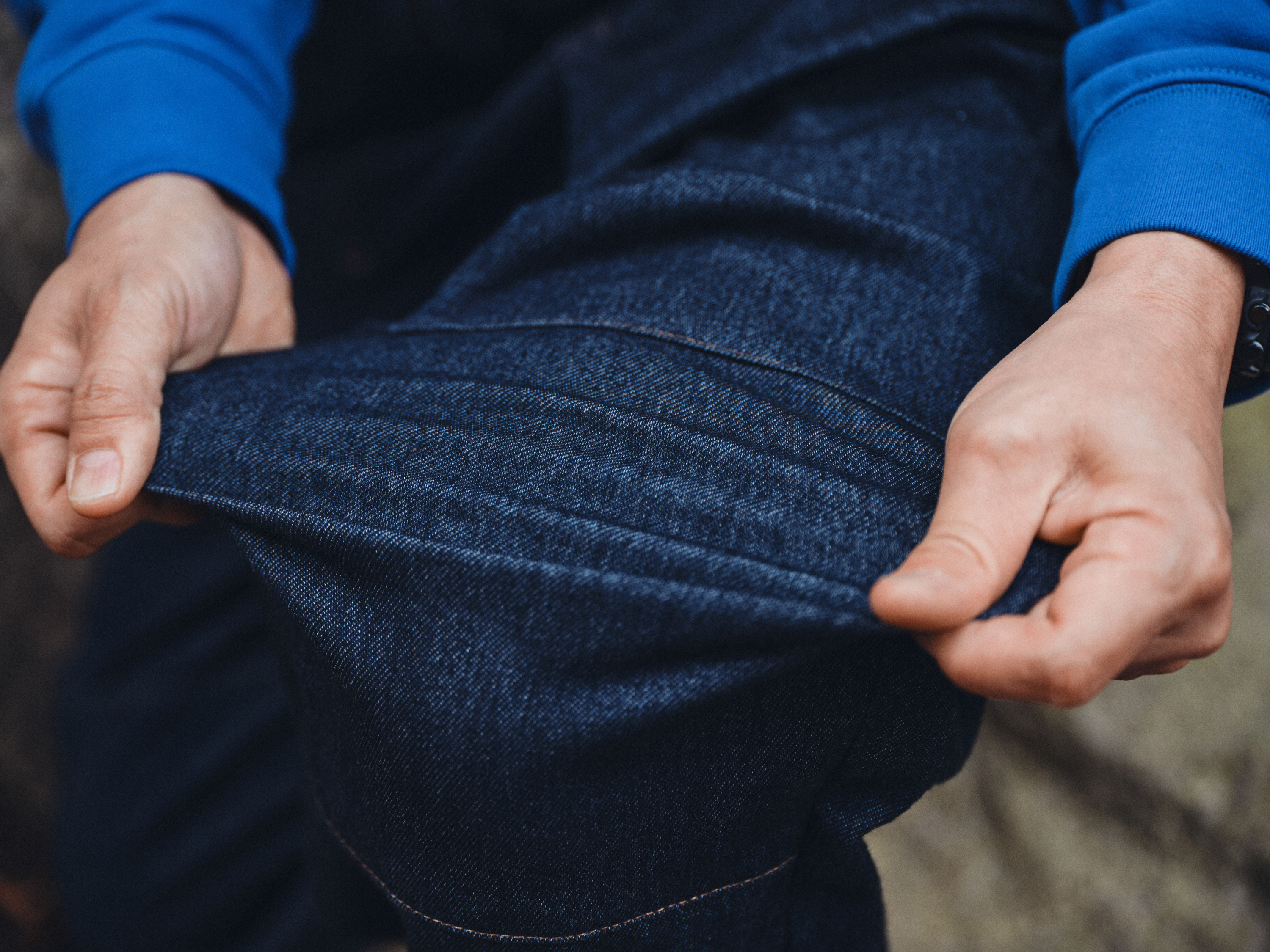 更に前膝に切り替えを加える等、デザインバランスをアレンジ。更に編み物であるDENITを考慮し、裏側に補強テープを配置する事で、物性面や実用による伸び垂れをカバー。