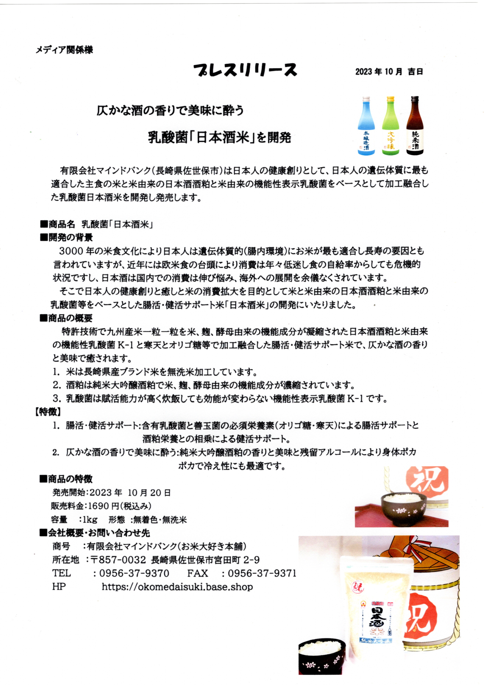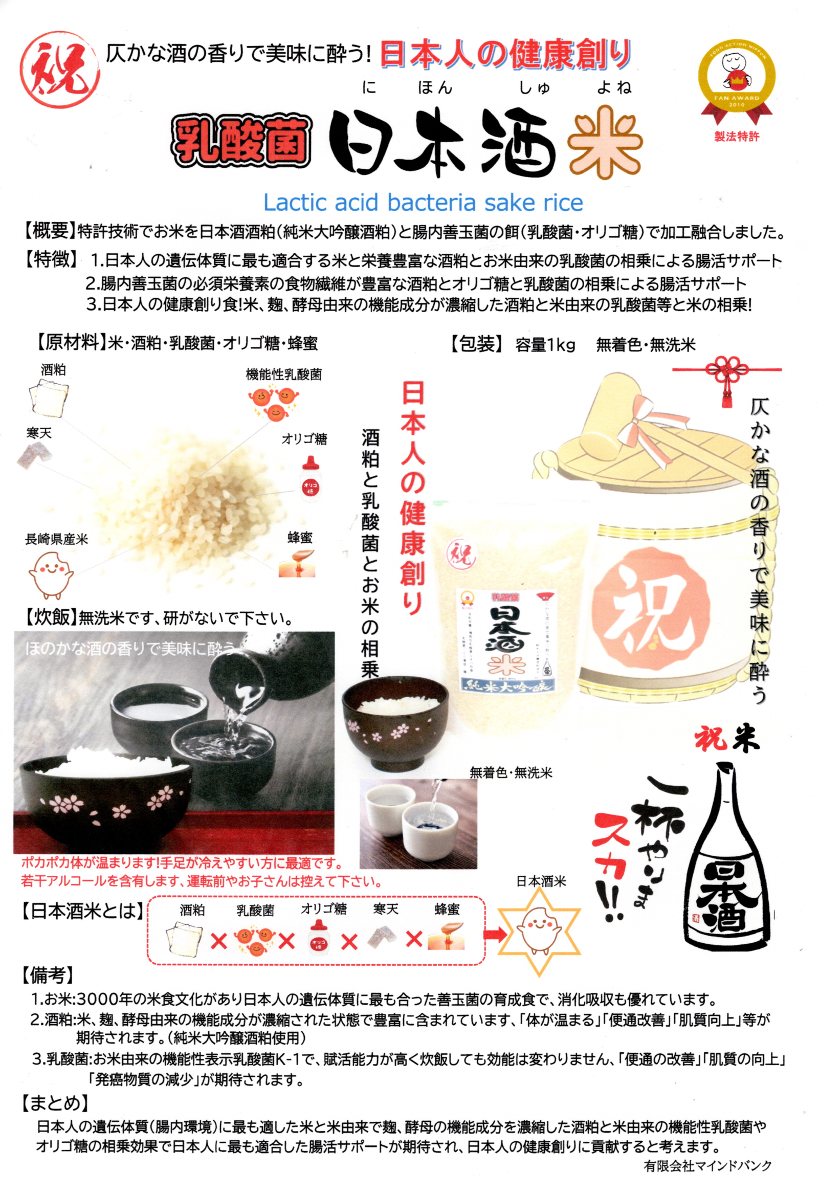 有限会社マインドバンク(長崎県佐世保市)は日本人の健康づくりと癒しを希志て、仄かな酒の香りで美味に酔う、乳酸菌日本酒米を開発しました。