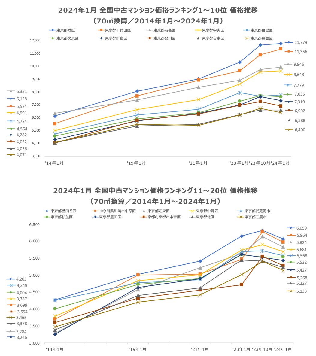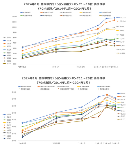 「不動産×WEB×ビッグデータ」の領域で、さまざまな不動産テックサービスを展開する株式会社ワンノブア カインド(本社:東京都港区、代表取締役社⻑:川島直也、以下当社)は、当社が運営するマンション情報サイト「マンションレビュー」の保有データを元に、2024 年 1 ⽉の全国市区町村における中古マンションの相場を 調査。坪単価をベースに 70 ㎡での価格に換算した「中古マンション価格」*1と価格ランキング上位 20 件について過去 5年間の価格推移、および1 年前からの価格の上昇率を表す「騰落率」のランキングを発表いたします。