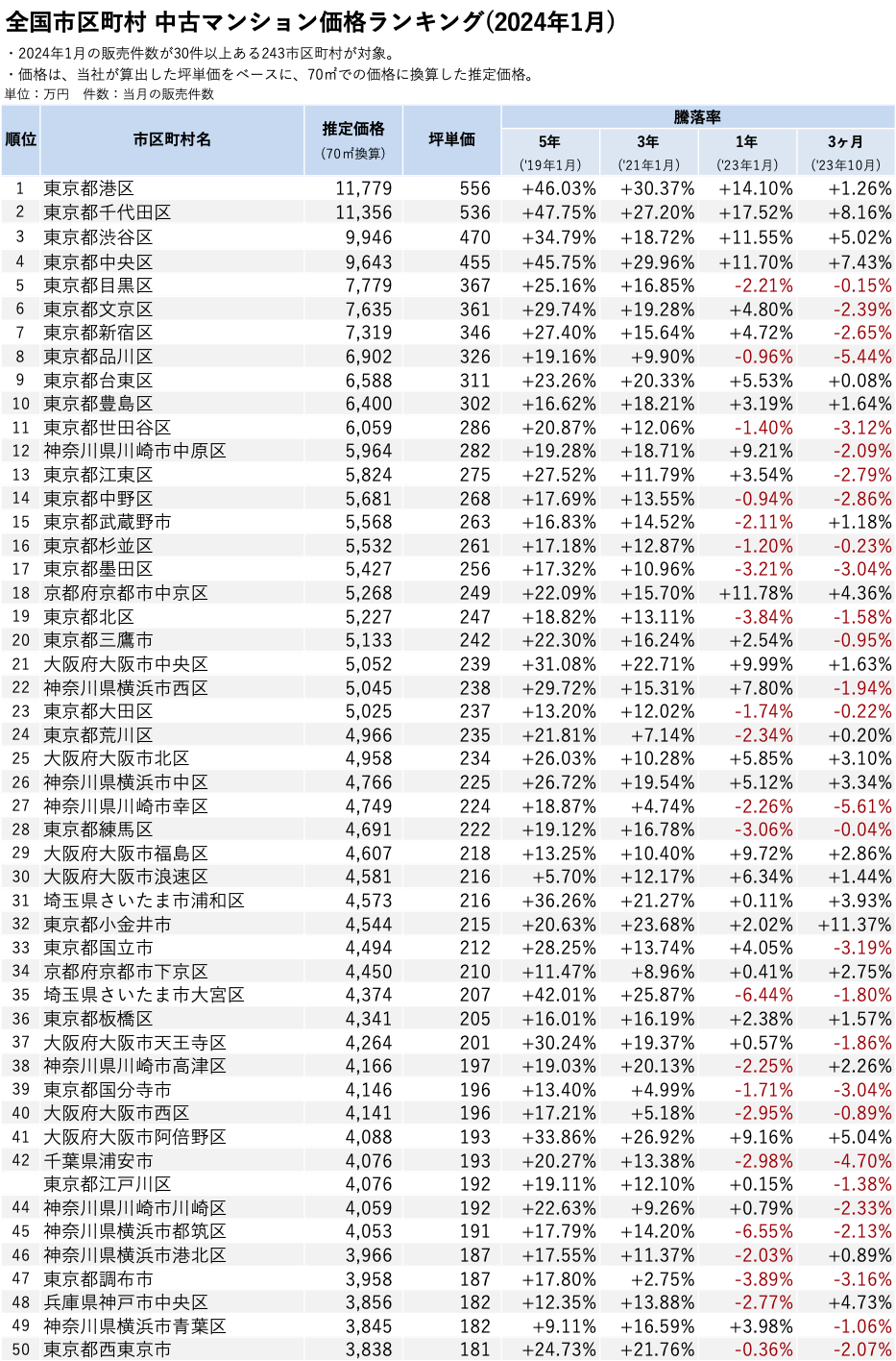 「マンションレビュー」2024年1月 全国市区町村 中古マンション価格/騰落率ランキングを発表