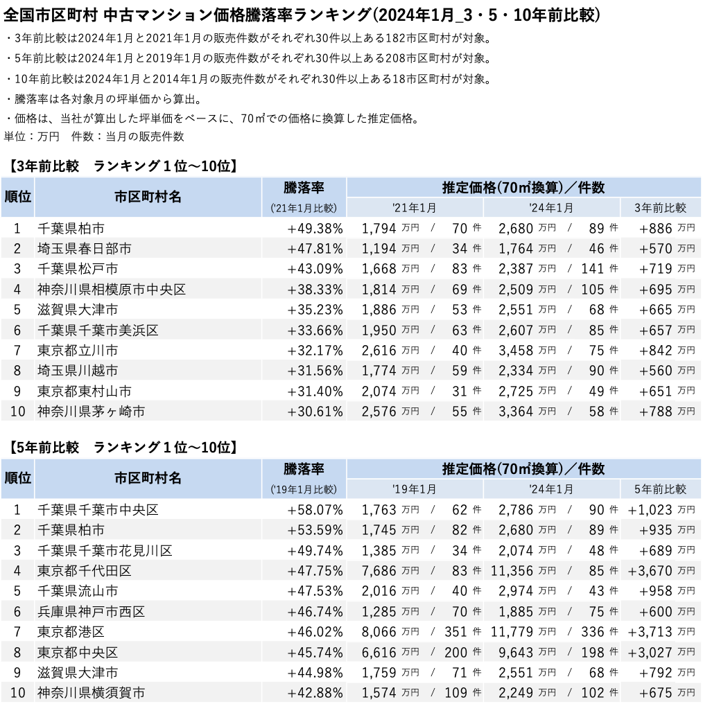 【全国市区町村 中古マンション騰落率ランキング(2024年1月_3・5年前比較)】