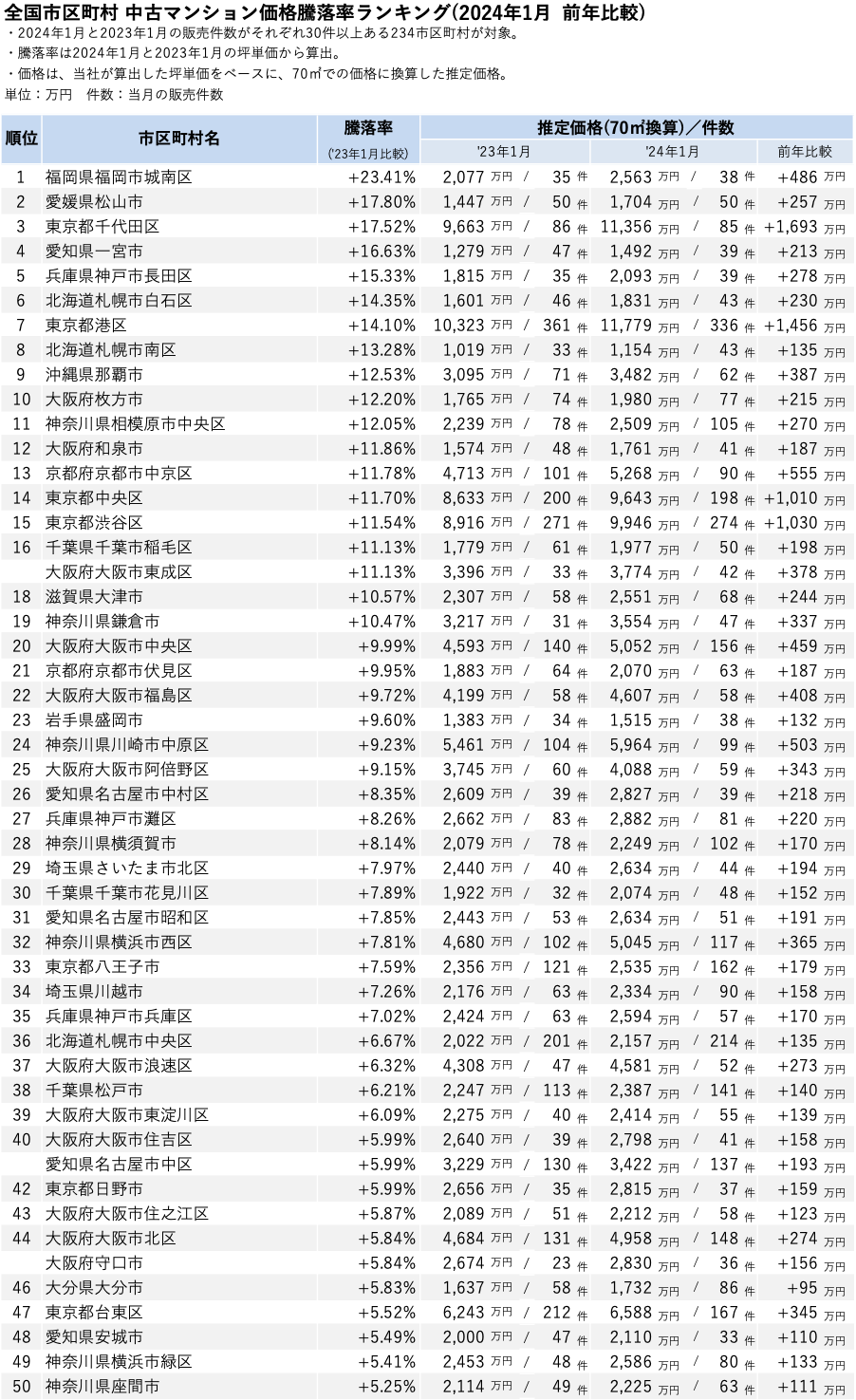 【全国市区町村 中古マンション騰落率ランキング(2024年1月)】