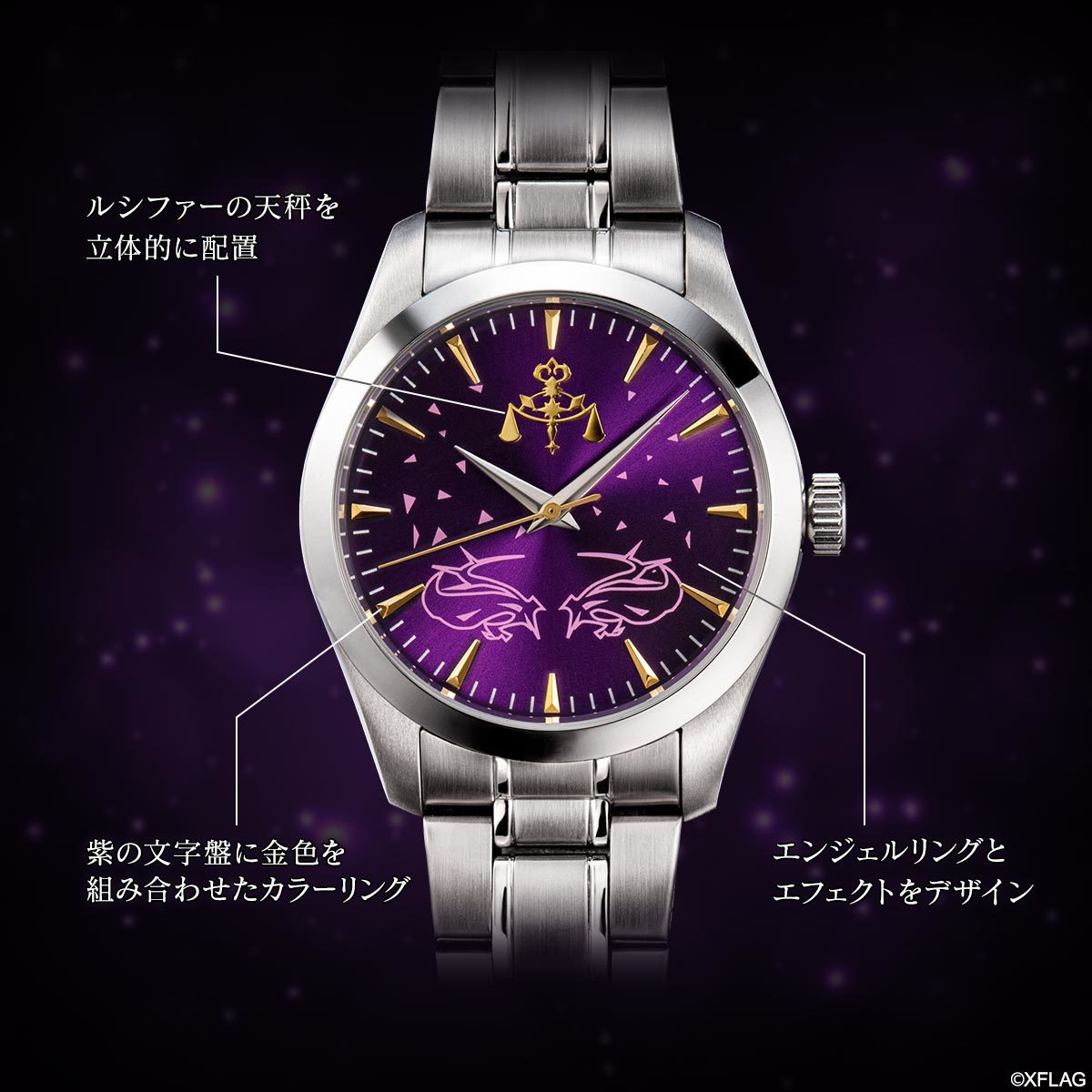 紫の文字盤に金色を組み合わせたカラーリングで、ルシファーの天秤やバーインデックスを立体的に配置。ルシファーのエンジェルリングとエフェクトをデザインしました。