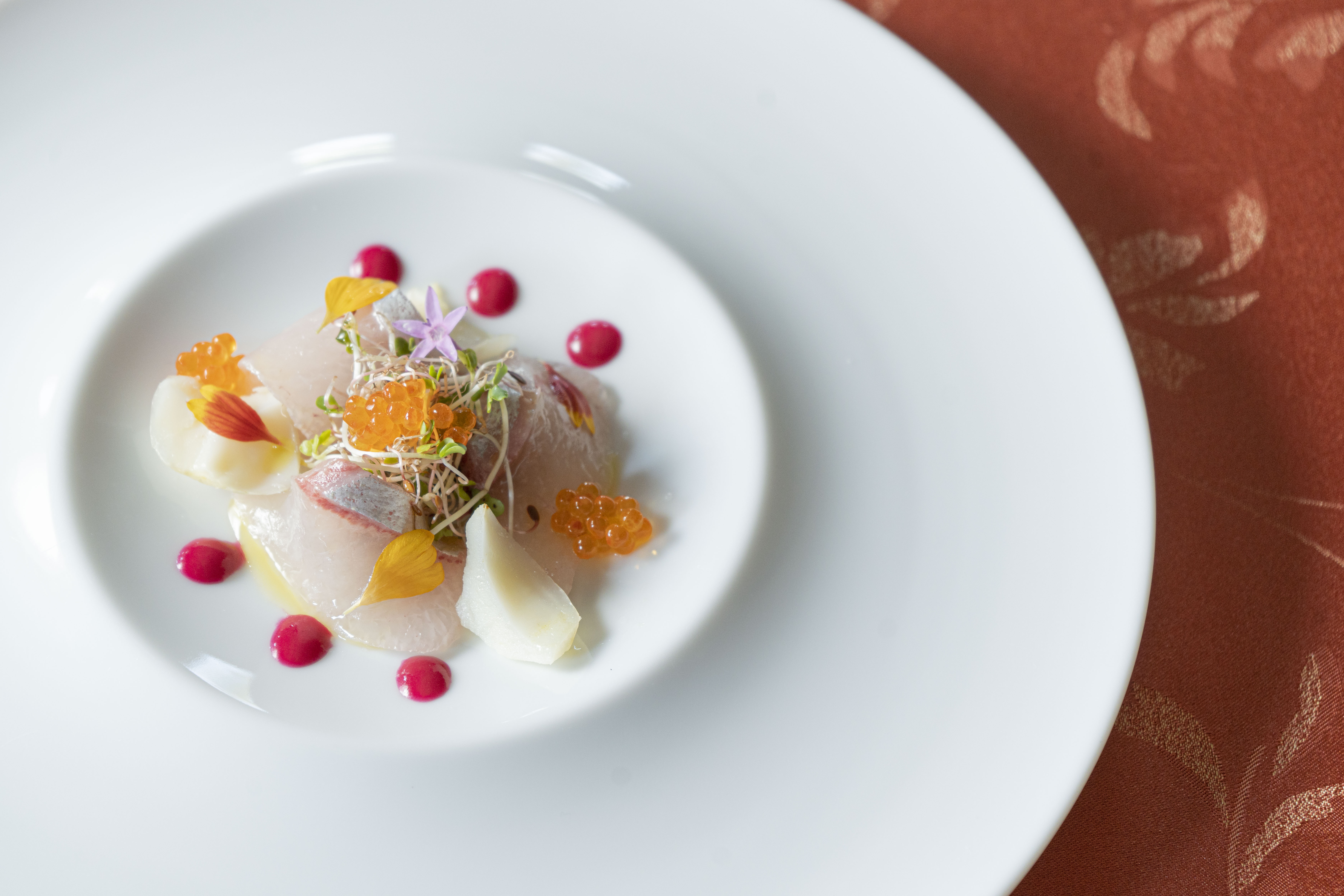 フランス料理とイタリア料理を融合させ、素材本来の特徴を最大限に活かした料理を創作する「Grand Baobab」では、活きのいい鮮魚を薄くスライスしたカルパッチョに、味わい豊かで歯ごたえのある六甲シャンピニオンを酢漬けにし、鮮やかな赤色と独特な甘みを持つビーツを使用したソースでお召し上がりいただく前菜を提供。その後、甘みが強く身が引き締まった淡路島産の足赤海老を淡路島産の玉ねぎと一緒にこんがりと焼き上げ、ターメリックのエキゾチックな風味を加えた一品や、歯ごたえがありながらも柔らかく旨味が凝縮された淡路鮑と肉厚で風味豊かな淡路椎茸を使用したパスタなど、淡路島の秋食材が持つ素材本来の味を活かしたフレンチコースをご堪能いただけます。