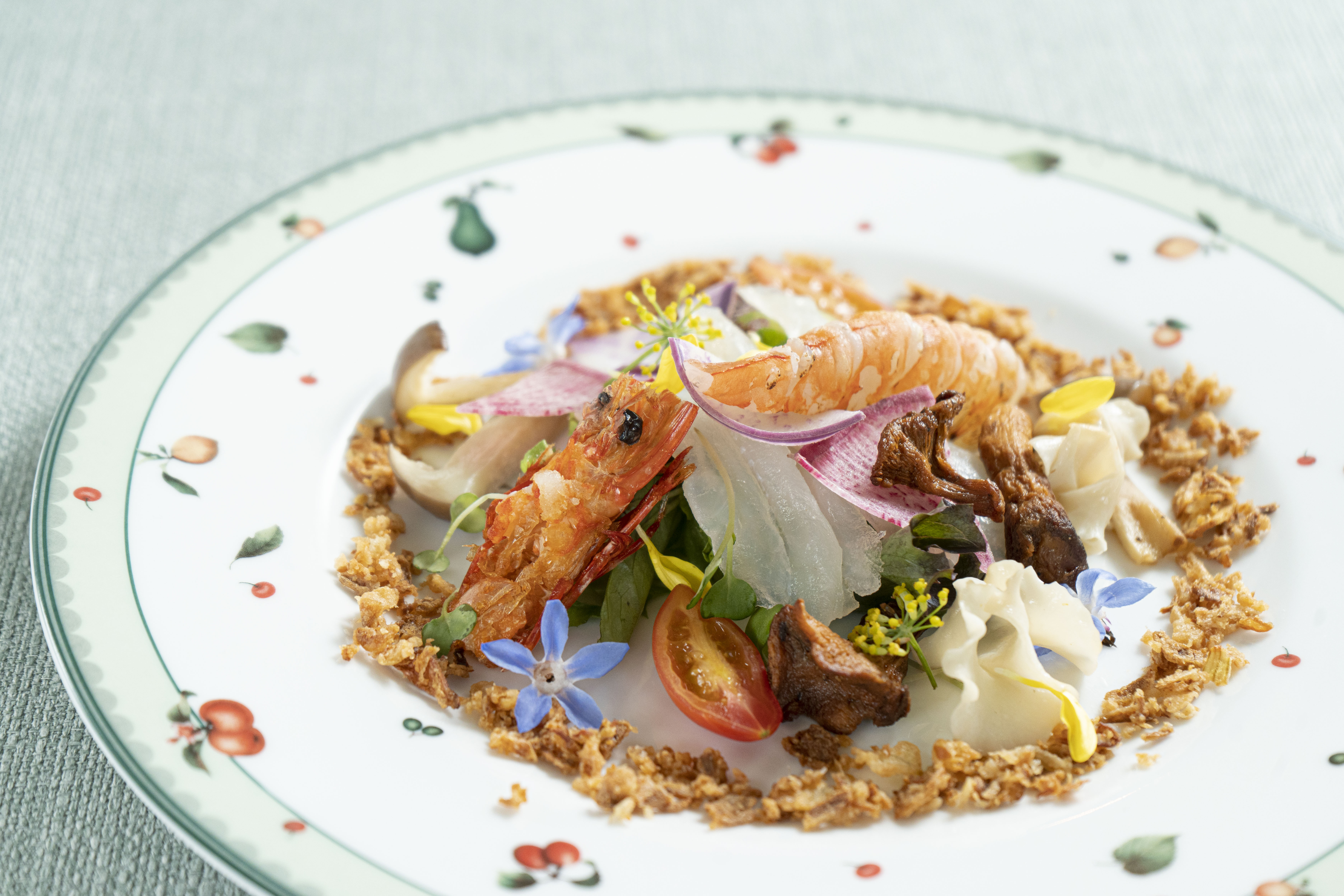Premier:紅葉鯛と足赤海老の炙り 茸のマリネのサラダ仕立て