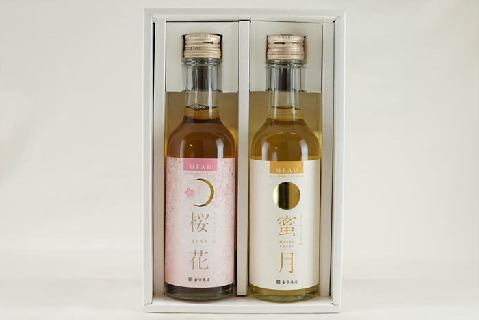 蜂蜜酒(ミード)は、蜂蜜に水と酵母だけを加え、発酵させた醸造酒。創業91年の老舗蜂蜜屋である金市商店が、蜂蜜にこだわって造ったオリジナルミード「はちみつのお酒 蜜月」「はちみつのお酒 桜花」をギフトセットにしました。