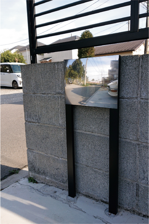 しかし近年、隣地との境目に塀やフェンスを設置しない住宅が増え、従来の壁付けタイプでは対応できないケースも増えてきました。そこで、壁面を必要としない「FFミラー自立埋込タイプ」を開発。FFミラーを2本の柱に取り付けて設置します。シンプルデザインなので、景観も損ねません。