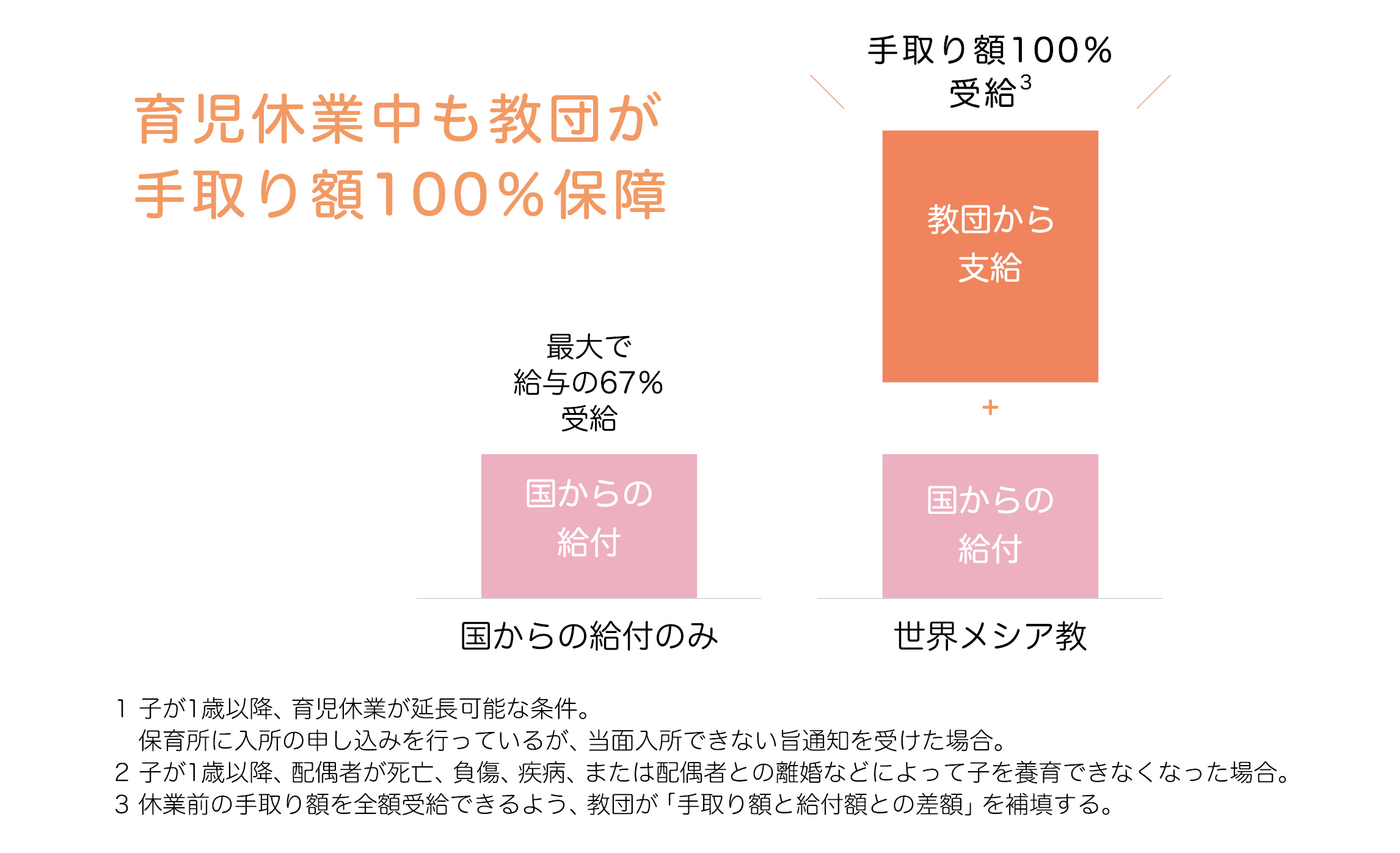 ・男性職員の場合、配偶者が出産後8週間のうち4週間は、国からの給付金が支給されるところ、その間、休業前の手取り額を全額受給できるよう、教団が手取り額と給付額との差額を補填し、保障。