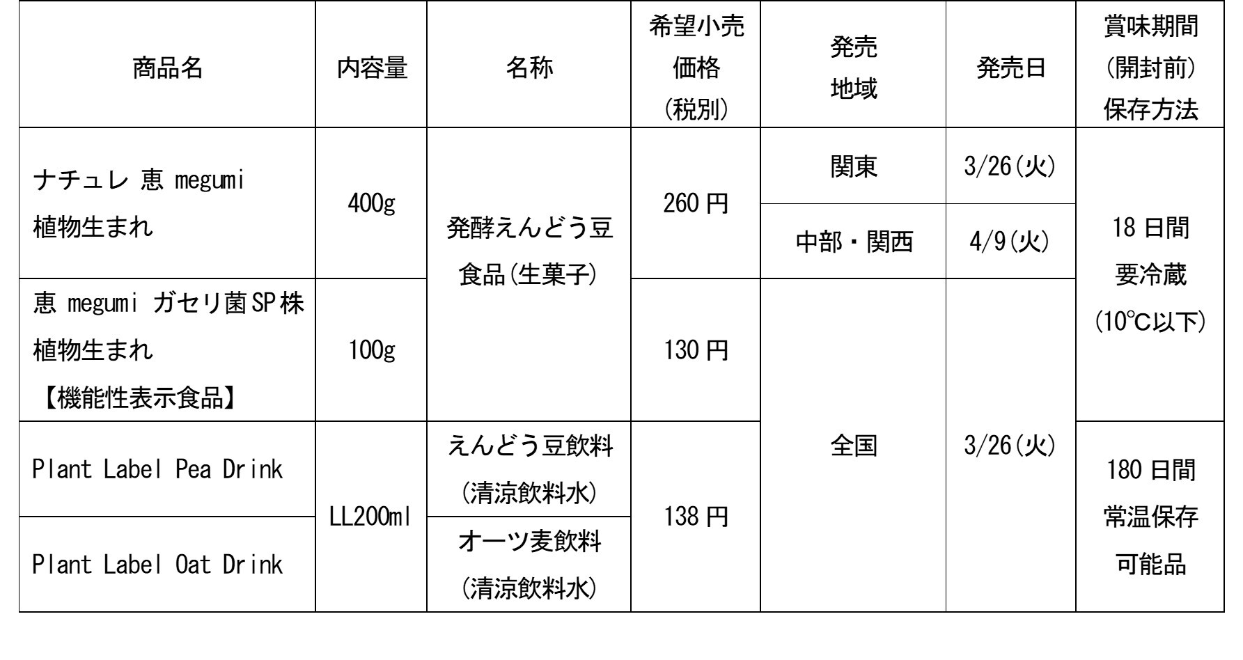 『ナチュレ 恵 megumi 植物生まれ』、『恵 megumi ガセリ菌SP株 植物生まれ』、『Plant Label Pea Drink』は、植物性素材の一つとして世界的に注目が集まり、今後日本でも成長が見込まれる「えんどう豆」由来の原料を使用しています。「えんどう豆」は、低脂質であり、たんぱく質や食物繊維が豊富で栄養面にも優れた素材です。