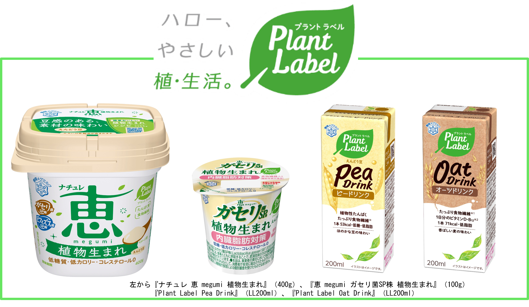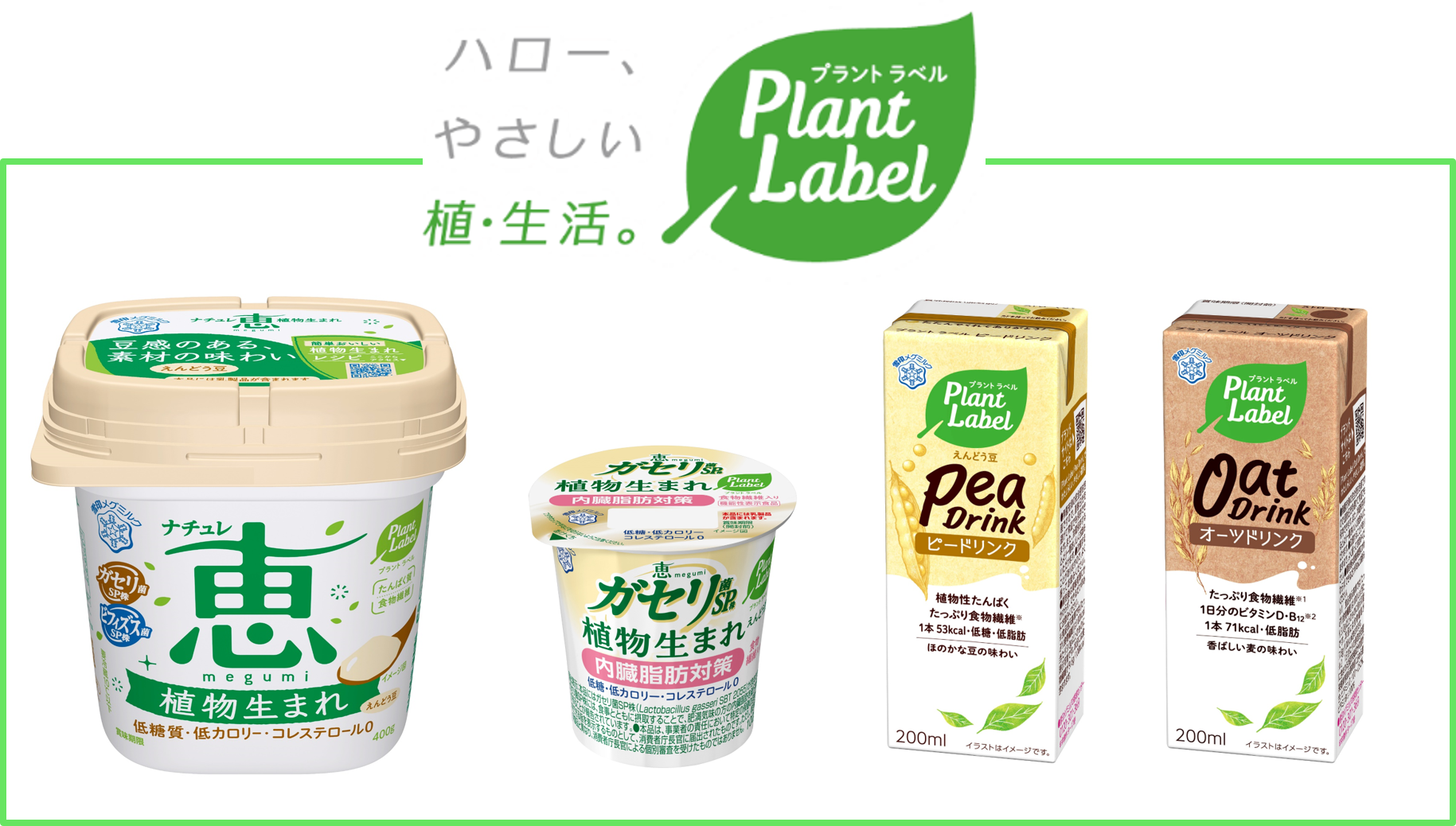 雪印メグミルク株式会社(本社:東京都新宿区、代表取締役社長:佐藤 雅俊)は、プラントベースフードブランド「Plant Label」(プラントラベル)を立ち上げ、本格的にプラントベースフード市場に参入いたします。『恵 megumi ガセリ菌SP株 植物生まれ』(100g)、『Plant Label Pea Drink』(ピードリンク)(LL200ml)、『Plant Label Oat Drink』(オーツドリンク)(LL200ml)を2024年3月26日(火)より全国にて、『ナチュレ 恵 megumi 植物生まれ』(400g)を3月26日(火)より関東にて、4月9日(火)より中部、関西にて新発売します。