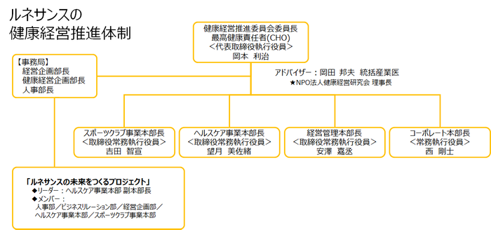 また、経営トップと各事業や機能部門の役員を中心とした「健康経営推進委員会」に「ルネサンスの未来をつくるプロジェクト」※2を加え、各事業や機能部門が主体的に健康経営に関与、連携を図り、実行力をあげるための体制づくりを行っています。