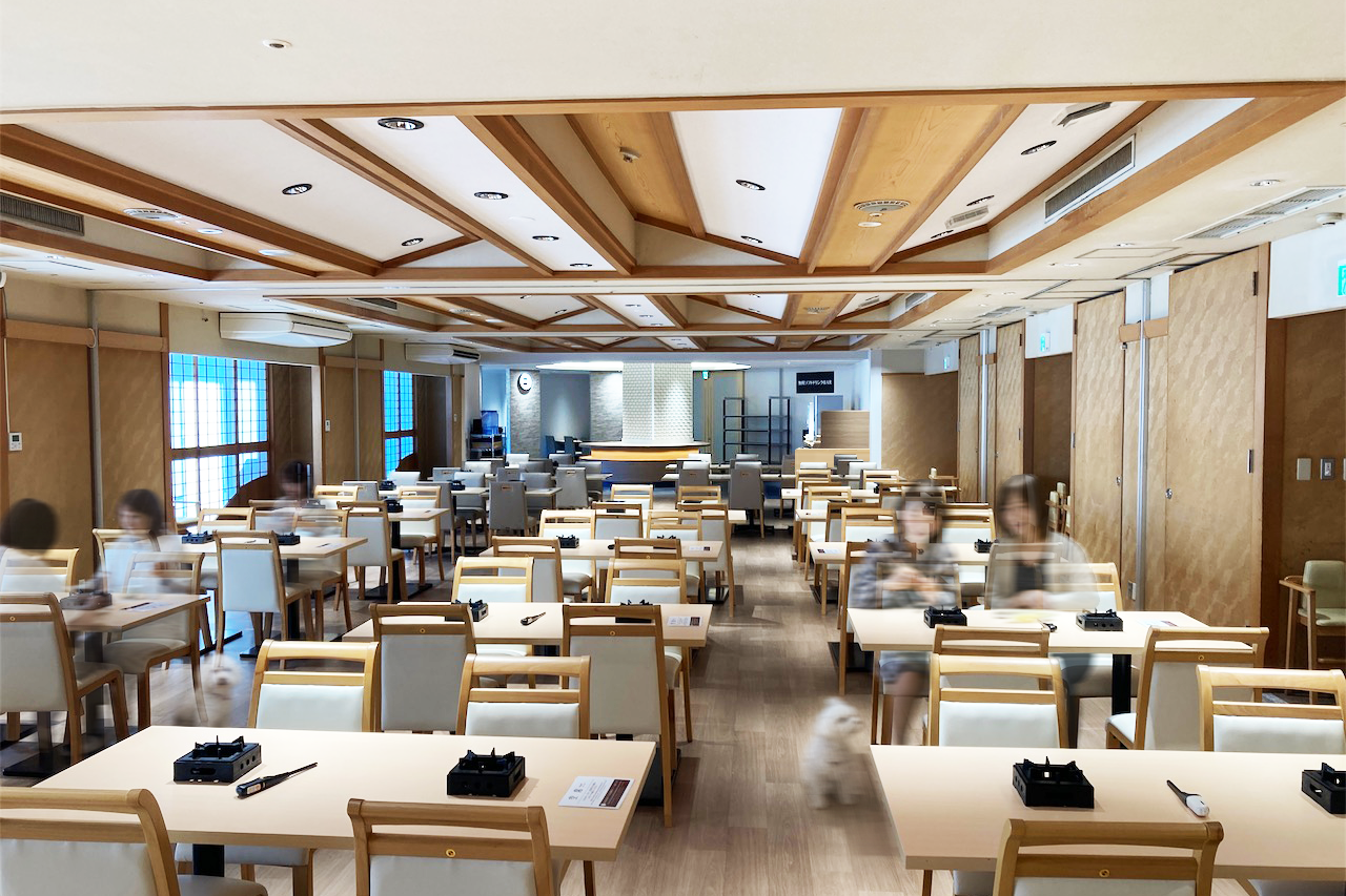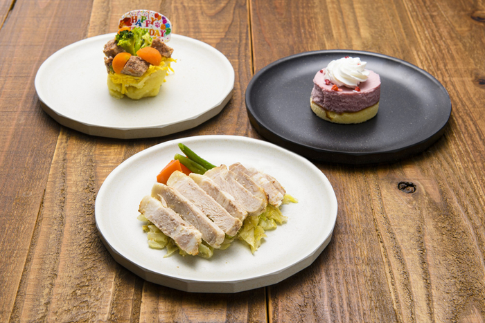 お食事の時間もわんちゃんと一緒にお過ごしいただけるよう、今回のリニューアルでレストランを改装。季節限定メニューを含む夕食・朝食ともに種類豊富なバイキングをお楽しみいただけます。また、わんちゃんには、ハンバーグプレートやポークソテーなどのお食事系から、ケーキなどのデザートまで、種類豊富な専用の別注わんちゃんグルメもご用意いたします。(有料)