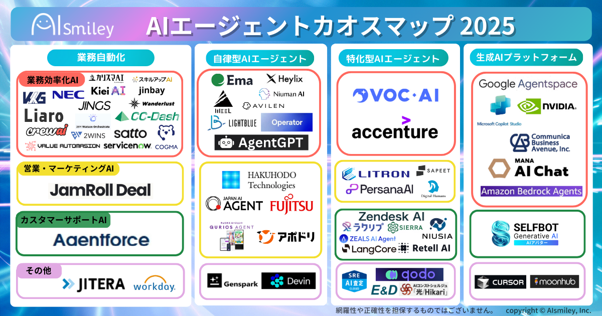 AIエージェントカオスマップは、AIエージェントサービスを体系的に分類し、各企業が自社に最適な製品を選びやすくすることを目的としたカオスマップです。「自律型AIエージェント」、「業務自動化」、「生成AIプラットフォーム」、「特化型AIエージェント」の4カテゴリに分類、それぞれをカオスマップとしてマッピングしております。