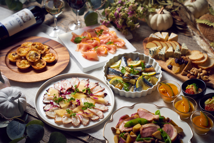ブルーチーズと豆乳のムース 柿ソース, かぼちゃのムース カルダモンの香り, 燻製ポテトとブロッコリーのアーリオオーリオ, サンマと焼き茄子のマリネ, 栗ときのこのキッシュ, チーズとドライフルーツ 生ハムとフルーツ, ミックスサラダ,他