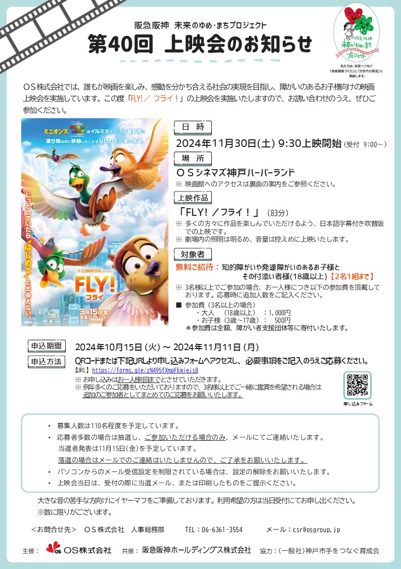 シネマコンプレックス「OSシネマズ」を経営するオーエス株式会社(本社:大阪市北区、代表取締役:髙橋秀一郎)は、阪急阪神ホールディングスグループの社会貢献活動「阪急阪神 未来のゆめ・まちプロジェクト」の一環として、知的障がいや発達障がいを持つお子様とそのご家族を対象とした映画上映会を、11月30日(土)にOSシネマズ神戸ハーバーランドで実施いたします。