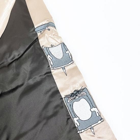 まずは、こちらのスカジャンからご紹介していきます。トムがジェリーを追いかけている、まさにトムとジェリーといえば!というデザインです。トムの本気で追いかけている顔とジェリーのおちょくっているような顔が二人の関係性を表していてトムジェリファンにはたまりません!