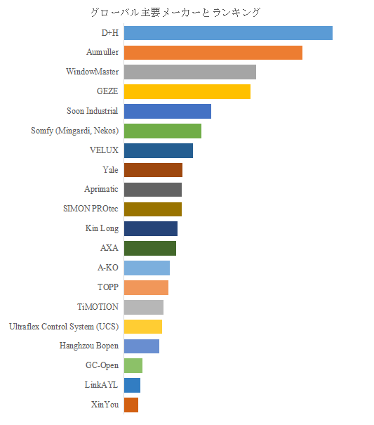 LP Informationのトップ企業研究センターによると、ウィンドウオープナーの世界的な主要企業には、D+H、Aumuller、WindowMaster、GEZE、Soon Industrial、Somfy (Mingardi, Nekos)、VELUX、Yale、Aprimatic、SIMON PROtecなどが含まれる。2024年、トップ5企業は売上ベースで約37%の市場シェアを占め、トップ10企業では約50%を占めるなど、市場は一定の寡占構造を示す。これら企業は、自社の技術力を活かし、電動・自動化機能の製品ラインナップを拡充するとともに、IoT対応やBMS連携機能の提供を強化している。また、欧州・北米・アジアの各地域で現地法人や代理店網を構築し、グローバル市場への迅速な展開力を持つことが競争優位性を高めている。