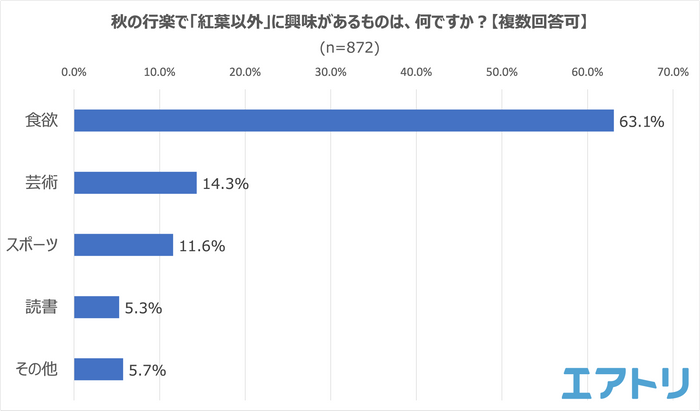 紅葉以外には、「食欲」に興味がある人が最も多く、2位の「芸術(14.3%)」と48.8ポイントもの大差で63.1%でした。そして3位は「スポーツ(11.6 %)」となりました。