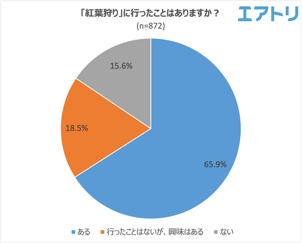 今までに「紅葉狩り」に行ったことがあるかを聞いたところ、65.9%の人が「ある」と回答し、「行ったことはないが、興味はある」が18.5%、「ない」が15.6%となりました。