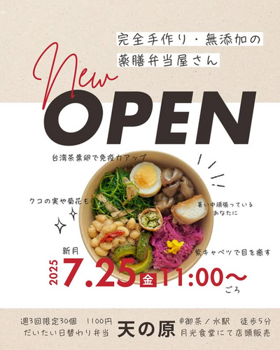 法律事務所での勤務や英語講師の経験を持ち、台湾・アメリカでの暮らしを通じて多様な食文化に触れてきた店主が、御茶ノ水に薬膳弁当「天の原」をオープンしました。