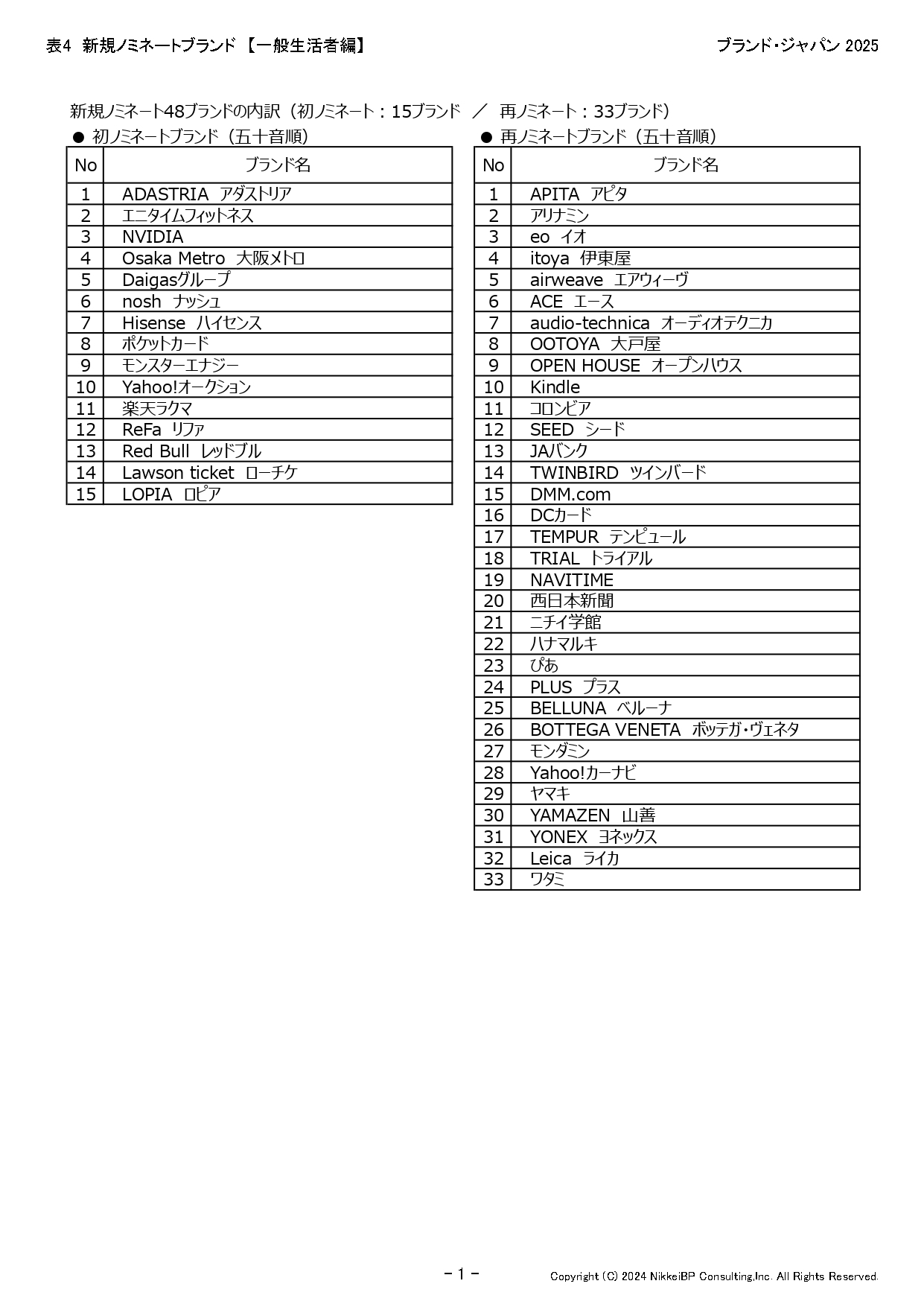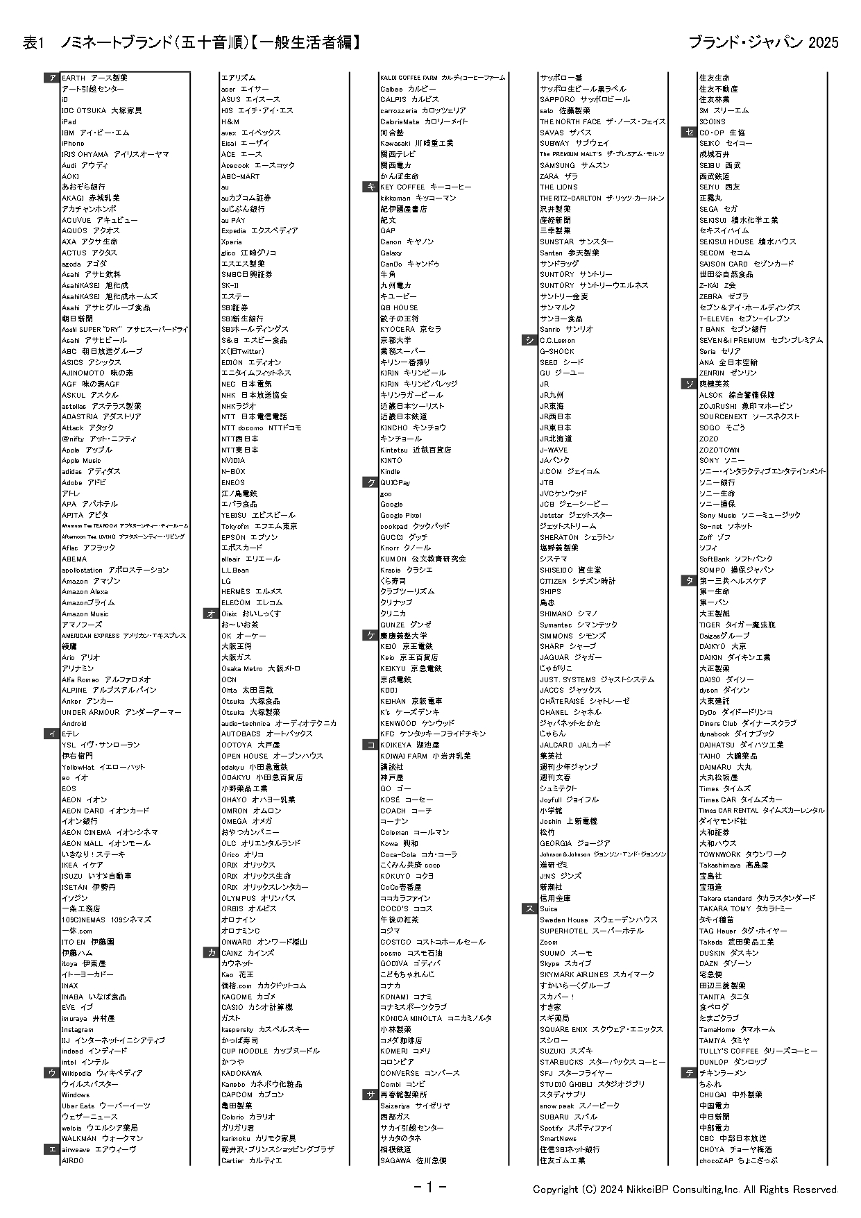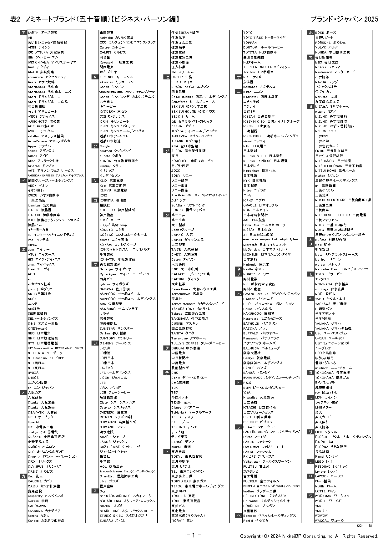 株式会社日経BPコンサルティング(東京都港区)は、2025年3月21日に発行予定の「ブランド・ジャパン2025」で調査対象となる1,500ブランド(一般生活者編1,000ブランド、ビジネス・パーソン編500ブランド)を発表した(表1~3)。