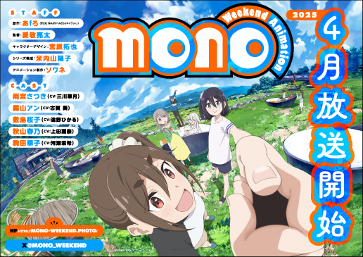 芳文社『まんがタイムきららキャラット』にて連載中の、『ゆるキャン△』を手掛けたあfろによる人気4コマ漫画『mono』。 この度、TVアニメ「mono」2025年4月放送開始が決定いたしました!さらに駒田華子のキャラクタービジュアル&PV、キャスト情報を発表いたしました。さらにキャスト解禁映像も公開。引き続き、公式サイトや公式Xにて最新情報をチェックしてください!