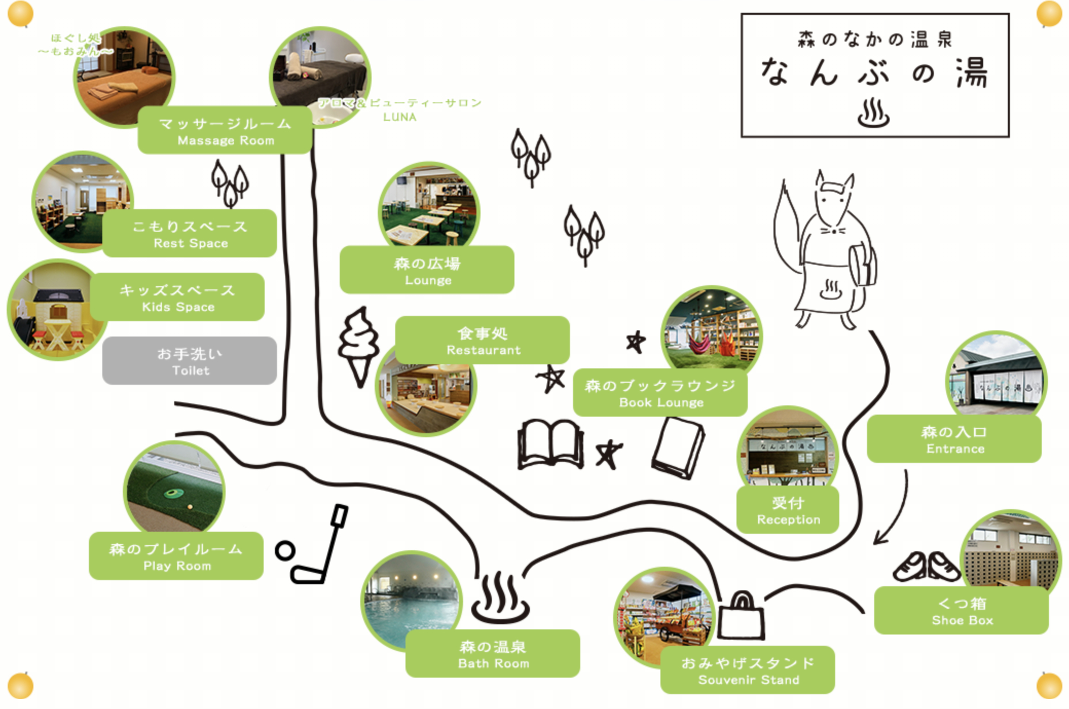 「森の温泉」をコンセプトに、森の中を探検するワクワク感と森林の癒しをイメージした可愛らしい空間へ内外装を大幅リニューアル。「一日遊べるくつろぎ空間 温泉×食事×読書」をコンセプトに最大の特徴である温泉はそのままに、新たに本格グルメを味わえる食事処や約8,000冊の漫画や本、雑誌を読書できる「BOOK LOUNGE」、そして自由におくつろぎいただけるスペースを多数設置。カウンターテーブルやWi-Fiも完備しておりますので、おひとり様からご家族連れまで、それぞれのライフスタイルに合った贅沢なリラックスタイムを満喫できる温泉施設に生まれ変わりました。