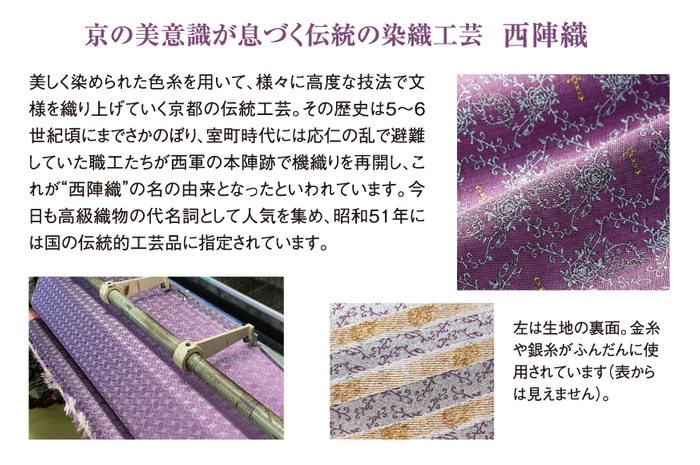 薔薇の気品が薫り立つかのごとく、精緻に織り上げられた文様の美しさ、ゴージャスで上品な風合いは西陣織ならでは。
