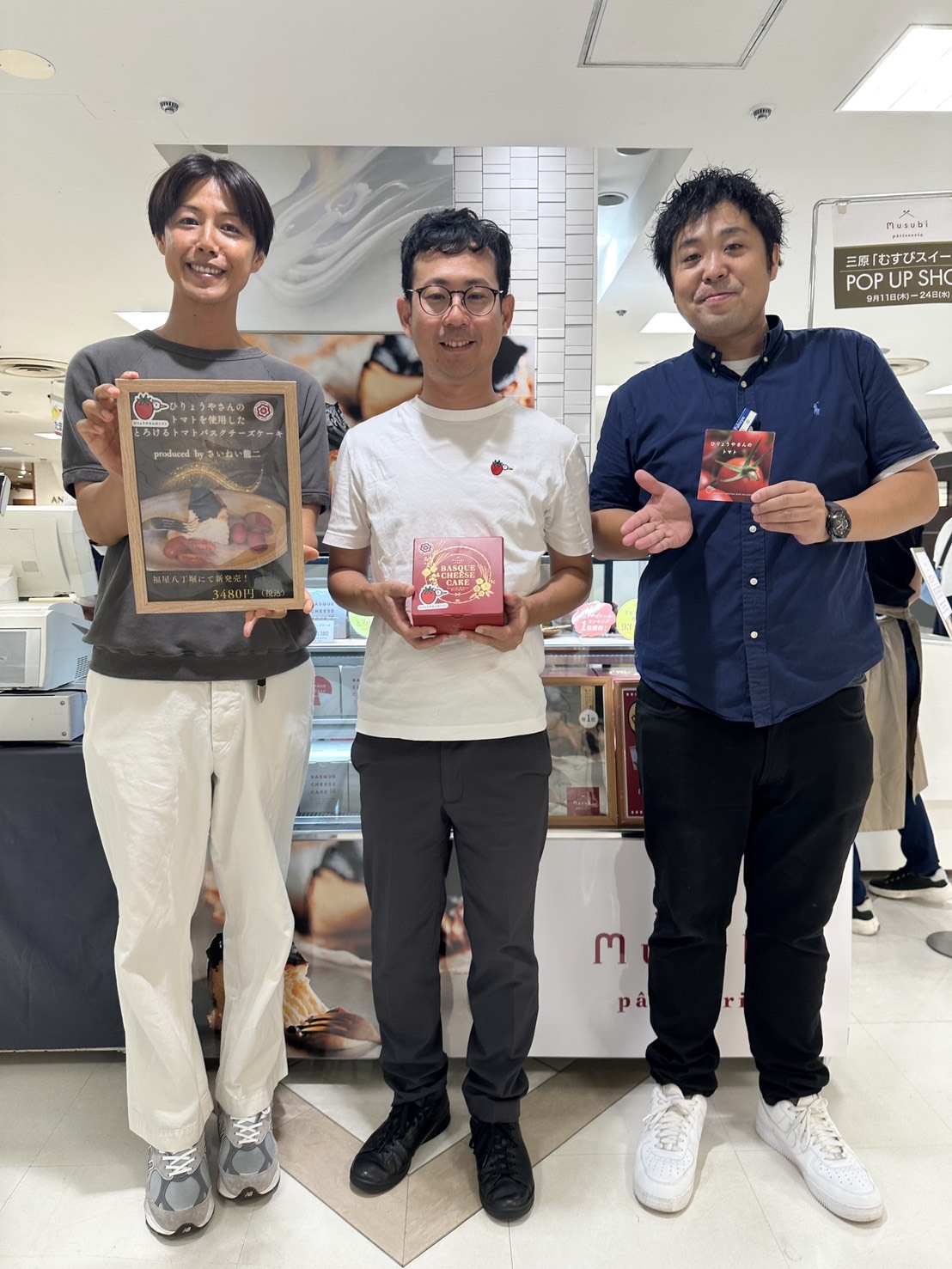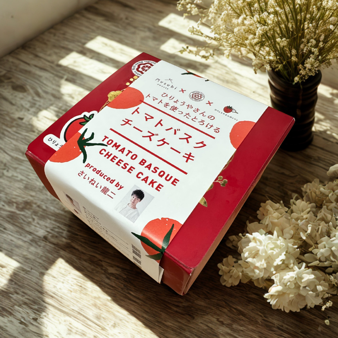 地元広島で、タレント活動もしながら農業も行っているさいねい龍二さん。自身が立ち上げたウェルビーイング野菜プロジェクト( https://well-being-vegetables.jp/ )に参加する「ひりょうやさんのトマト」と、さいねいさんがテレビの仕事で出会った「むすびスイーツ」とが同じ三原市であることから、コラボを発案し両社を繋ぎました。また第二弾のチーズケーキにかける特製トマトソースを考案し「さいねい農園」の加工施設で製造し、トマト・ケーキ・ソースのトリプルコラボが実現しました。