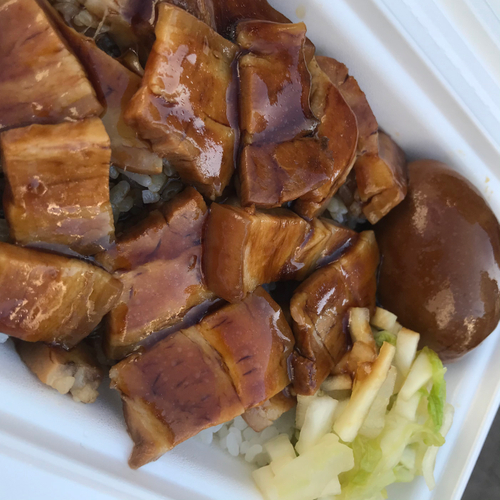おひる屋台の魯肉飯は二種類の豚バラ肉を使用しております。肉質の良い赤身と旨味の出る脂身の多い部位を3時間かけて煮込むため、トロトロ。八角、五香粉、ホールスパイスなど多くのスパイスを感じることができます。本場台湾の魯肉飯をよりパワーアップした味に仕上がっております。