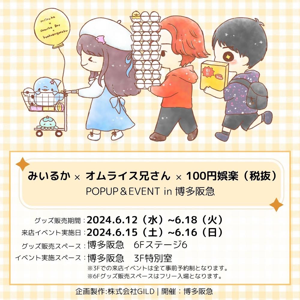 大人気&仲良し?クリエイター&イラストレーター3人、みいるか×オムライス兄さん×100円娯楽(税抜)のPOPUP企画展 & ファンと直接交流するイベントを、博多阪急にて開催致します。