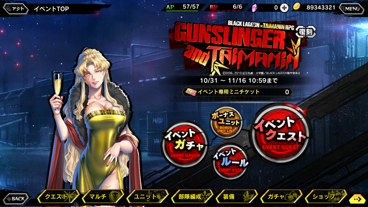 過去に登場したBLACK LAGOONコラボの期間限定ユニットを獲得できる、選択ピックアップガチャです。