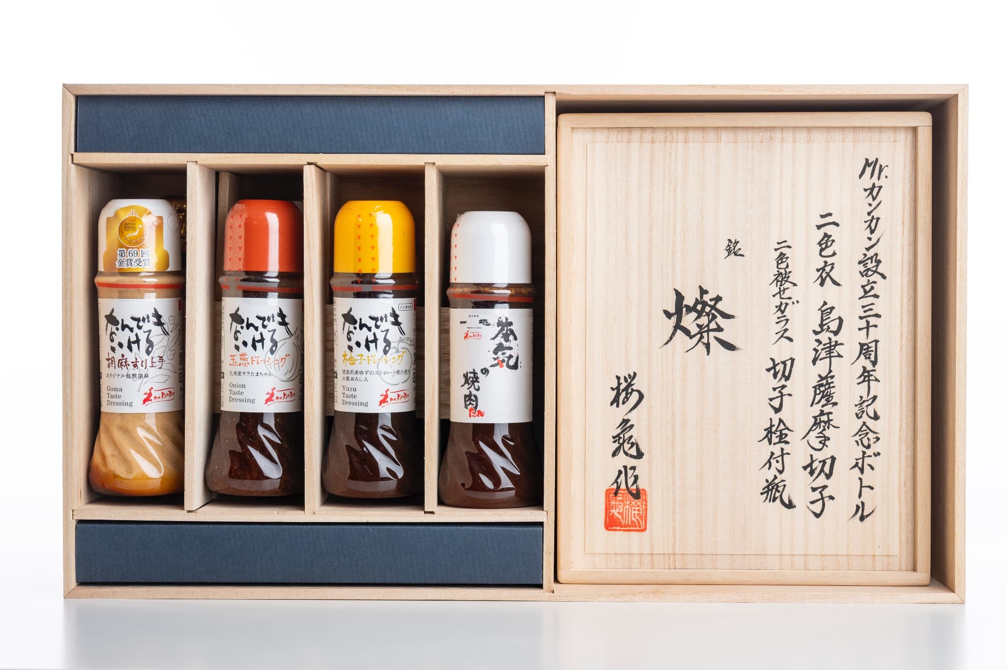 30周年を記念した限定セットとして、「Mr.カンカン×島津薩摩切子 プレミアムドレッシングセット」を発売いたします。数量限定30本、価格は税込30万円。