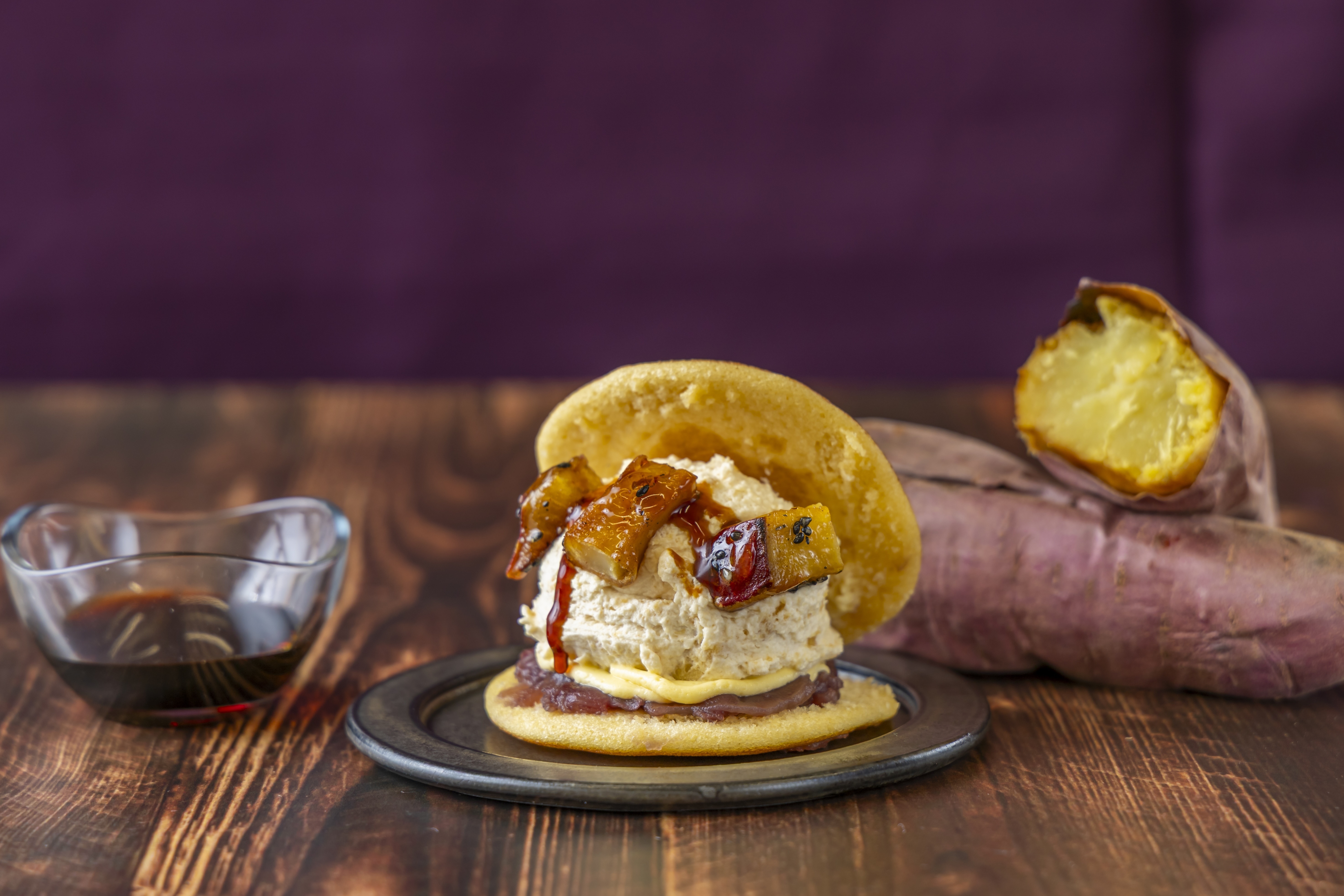 さつま芋ペーストを加えたたっぷりのホイップクリームの上には、ホクホク食感のさつま芋をトッピング。さらにコクのあるカラメルソースをとろりとのせた、季節限定のどら焼きです。