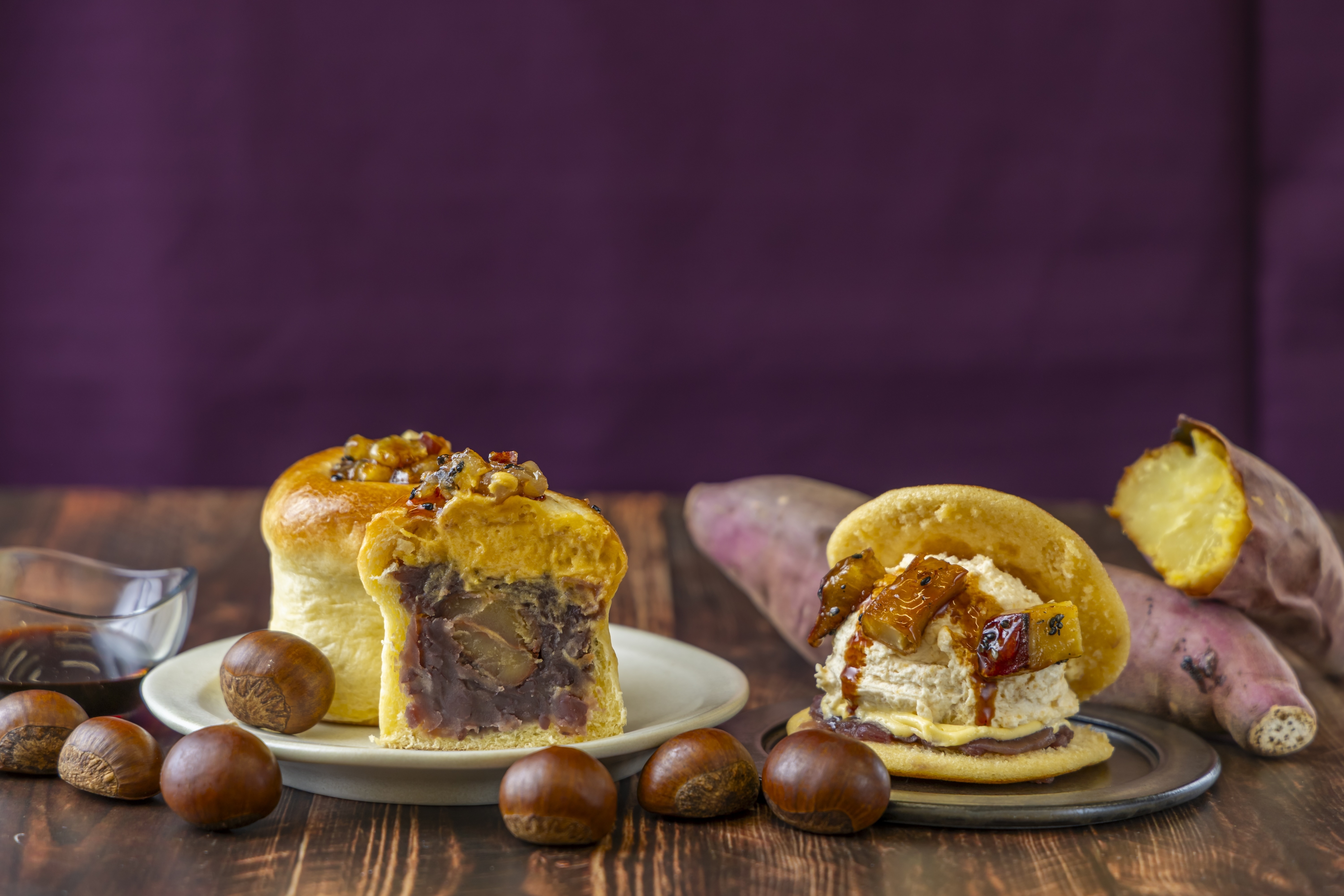この度、渋皮栗まるごと1粒とほっくり美味しいさつま芋にコクのあるカラメルを合わせた「熱海ばたーあんパン【芋栗カラメル】」と、さつま芋ペーストを加えたたっぷりのホイップクリームにホクホク食感のさつま芋とコクのあるカラメルソースをとろりとのせた「ばたーあんどら焼き【さつま芋カラメル】」の、深まる秋にぴったりの2アイテムを新発売します。又一庵のあんことバター、お芋とホクホクの栗、そしてコク深いカラメルが奏でる秋の味わいをご提供します。