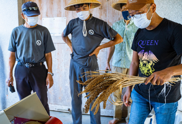 2021年7月 島の唯一の農業従事者である前本隆一氏のもとで、伝統手法の脱穀・精穀作業実践。