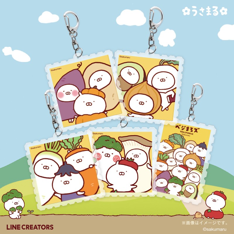 ・商品名:うさまる 切手型アクリルキーホルダー ベジまるズ(全5種) 各990円(税込)