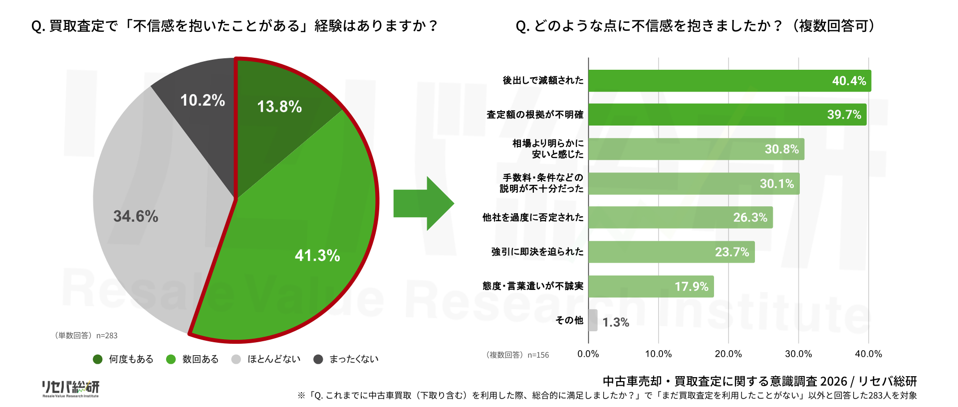 不信感を抱いた理由を見ると、最も多かったのは「後出しで減額された」(40.4%)で、次いで「査定額の根拠が不明確」(39.7%)、「相場より明らかに安いと感じた」(30.8%)、「手数料・条件などの説明が不十分だった」(30.1%)が続きました。金額そのものだけでなく、説明の透明性やプロセスへの納得感が欠けていることが、不信感につながっている様子がうかがえます。