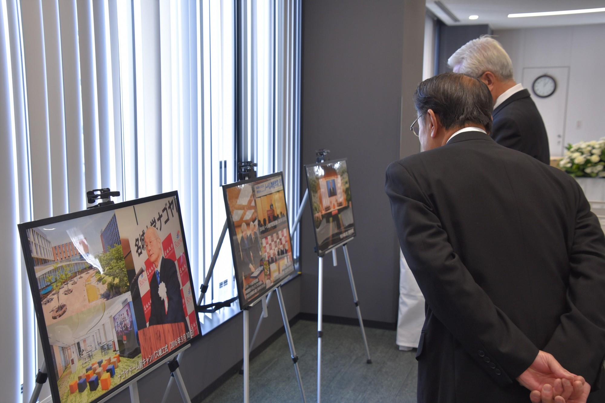 最後に、参列者は献花して故人に思いをはせ、2016年3月のナゴヤドーム前キャンパスの竣工式であいさつする姿や、2014年12月に赤﨑勇特別栄誉教授とともにノーベル物理学賞のメダルに目を向ける姿など、会場に並べられた理事長在任時の写真パネル6枚に見入りながら在りし日の姿を偲んでいました。