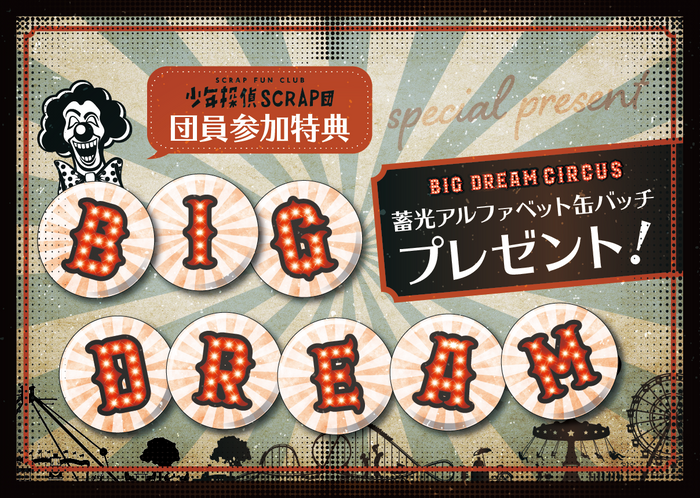 少年探偵SCRAP団(FC)限定参加特典は、物語の舞台である“ビッグドリームサーカス”のロゴと同じフォントの蓄光アルファベット缶バッジ。全26種よりお好きなアルファベットをお選びいただけます。