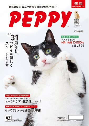 PEPPYとは「PET+HAPPY」の造語で、「PETにHAPPYになってもらいたい、そして人もPETと共にHAPPYになる」という想いが込められています。今では、全国8000件の動物病院様に年間100万冊以上のカタログを無料配布しており、愛犬・愛猫との快適な暮らしに役立つ情報を獣医師監修・指導のもと、安心・安全・信頼できる情報として発信しています。