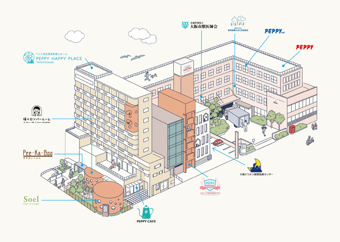 PEPPY本社のある敷地には、オフィスだけでなく、ペット共生型の有料老人ホーム「ペピイハッピープレイス」や、愛玩動物看護師を育成する養成所「大阪ペピイ動物看護専門学校」、「大阪どうぶつ夜間急病センター」、犬のほいくえん「Pee-Ka-Boo」などが併設されています。オフィスの内も外も、常に動物とふれあえる空間となっており、「ペットと共にある社会」を社員自身が体感しながら働ける環境です。