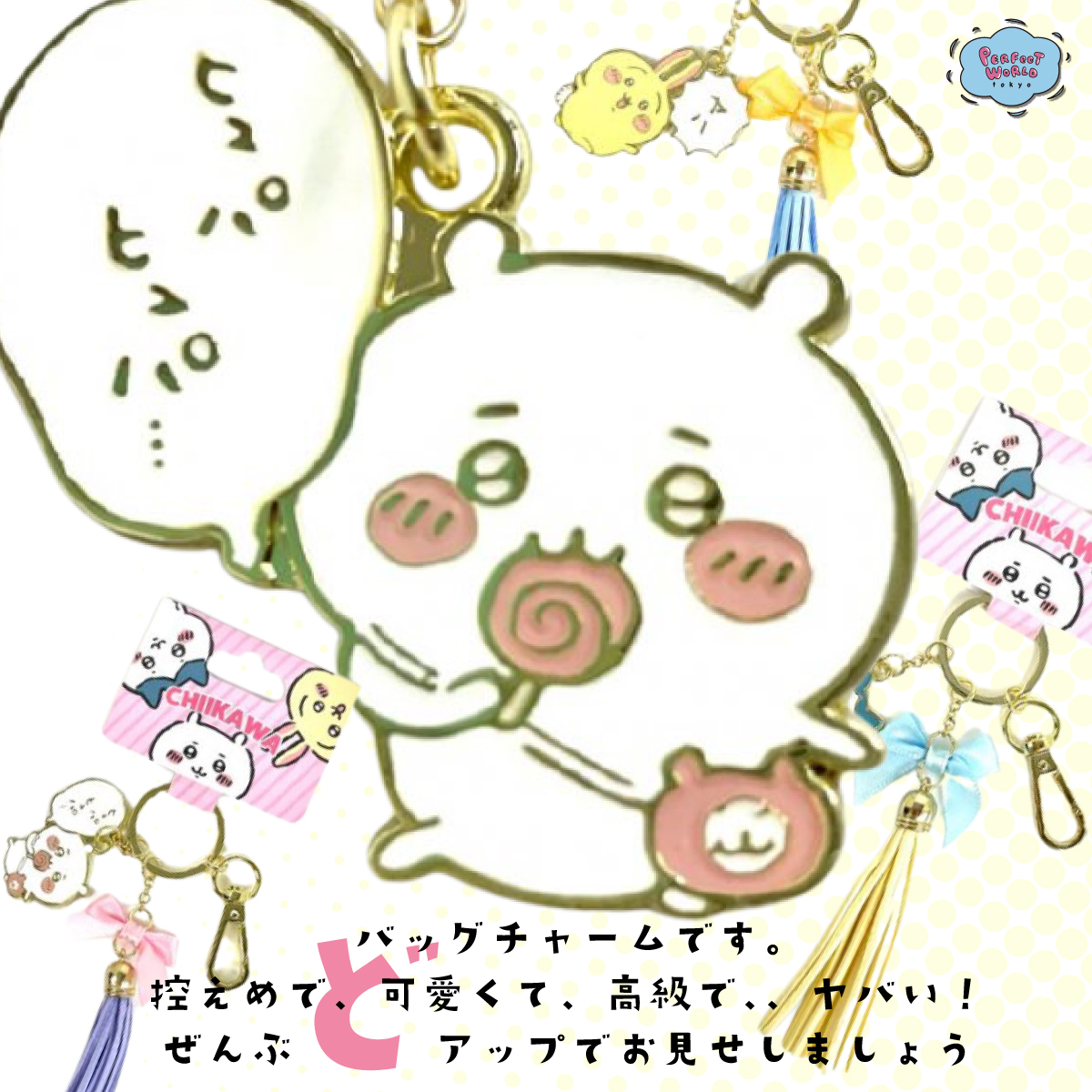 人気上昇中のキャラクターちいかわの、バッグチャームキーホルダーのお知らせです。キーホルダーにちいかわたちのキュートなチャームはもちろん、オシャレなタッセルまで付いていて存在感もたっぷり。バッグなどのアクセントにもなるキーホルダーです。